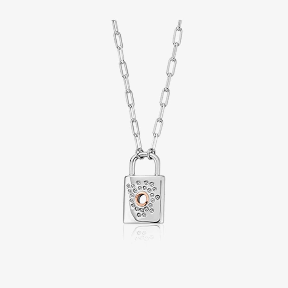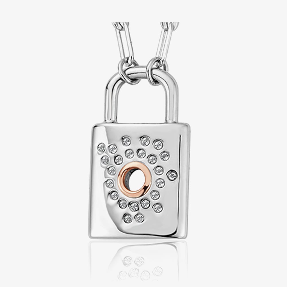 From Clogau, this Cariad Sparkle Padlock Necklace has been crafted with 925 sterling silver & rare 9ct Welsh rose gold adorned with twenty-four natural white topaz stones. Symbolising the gift of love & how it should be cherished & protected.