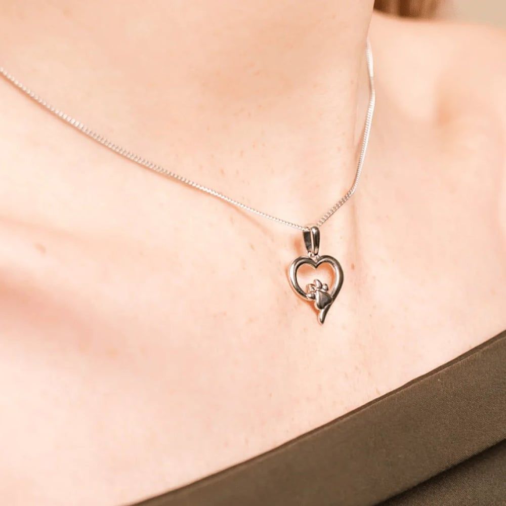 Beautifully crafted from sterling silver, this elegant pendant features a delicate heart design adorned with an adorable paw print motif. A sparkling white topaz adds a touch of brilliance, symbolising the joy and companionship pets bring to our lives. Suspended from a fine chain, this necklace is a meaningful and stylish keepsake—perfect for any animal lover.