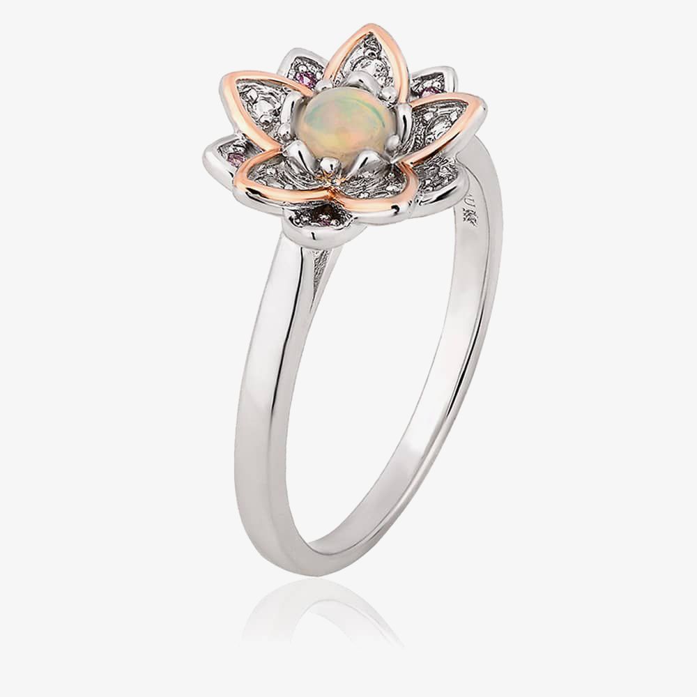 Taking inspiration from the incredible beauty of the lotus flower, this stunning two colour ring is adorned with opal and pink and white topaz to create this sparkling ring.