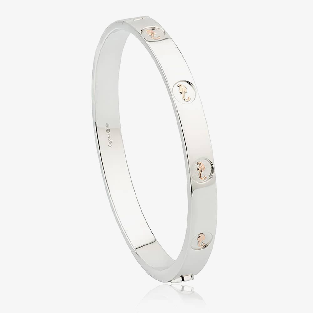 Clogau’s iconic filigree leaf design serves as the focal point of this stunning bangle. Crafted in sterling silver with 9ct rose gold elements, the classic design will compliment your everyday look. Finished with a hinged mechanism for easy wear and safe removal.