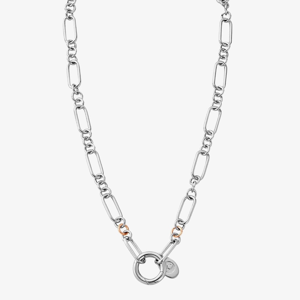 Clogau charms offer a delightful way to celebrate special milestones and create a collection of cherished keepsakes that will last a lifetime. Share your journey with the elegant Tree of Life Insignia Silver Charm Necklace, featuring a figaro-style chain made from sterling silver with 9ct rose gold accents. At 16 inches in length, this necklace is considered a choker. For added versatility, the matching bracelet can be connected to this necklace to form a longer chain.