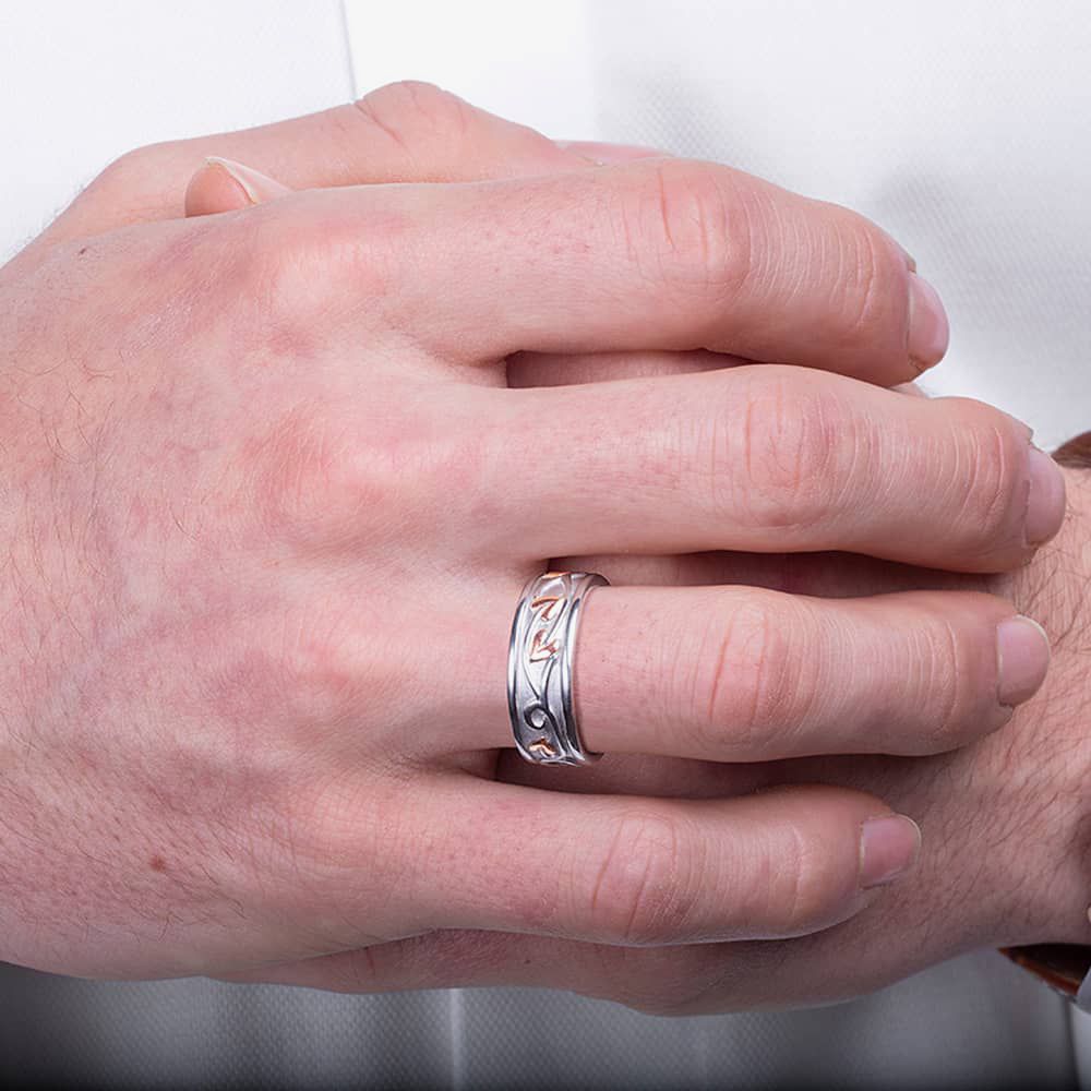 A combination of berries, leaves and vines represent new life forms that intertwine and evolve. This stunning tree of life band is crafted from sterling silver and features 9ct rose gold details.