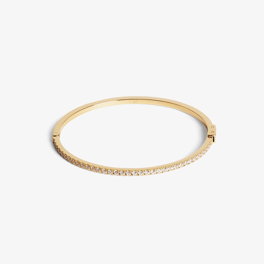 Timeless and refined, the Eternal Love Bangle by Coeur De Lion is crafted from gold-tone stainless steel and adorned with a single, sparkling cubic zirconia. With its sleek, minimalist design and secure hinged closure, this elegant piece is perfect for everyday sophistication or as a meaningful gift.