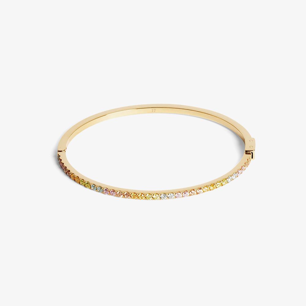 Graceful and eye-catching, this Eternal Love Bangle features a gold-tone stainless steel base adorned with sparkling multi-colour cubic zirconia stones. Handcrafted in Germany, it combines vibrant hues with elegant design for a versatile accessory that brightens any outfit.