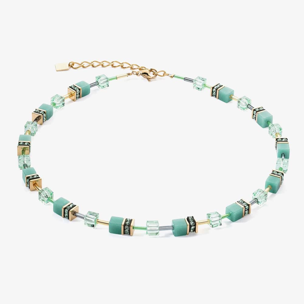 The GeoCUBE Iconic Mono Gold Plated Necklace in green combines calming green tones with the luxurious shimmer of gold. This elegant piece is part of the mono-tone-on-tone line, showcasing a harmonious blend of materials, including Swarovski crystals, rhinestone rondelles, glass, and stainless steel with a gold finish. The necklace measures 42cm in length, with an additional 6cm extension chain and a secure stainless-steel gold lobster clasp.
