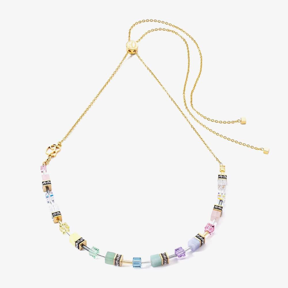 Elevate your style with the Coeur De Lion GeoCUBE Yellow Gold Tone Crystal Necklace, a stunning piece crafted from yellow gold-plated stainless steel with a polished finish. Featuring a beautiful blend of Amazonite, Aventurine, Rose Quartz, Chalcedony, Swarovski crystals, and Synthetic Tiger's Eye, this necklace adds a captivating sparkle to any look. The GeoCUBE Iconic Nature Chain, adorned with delicate pastel colours and shimmering gold, is a tribute to natural elegance, complete with the elegant COEUR DE LION logo discreetly placed on the side.