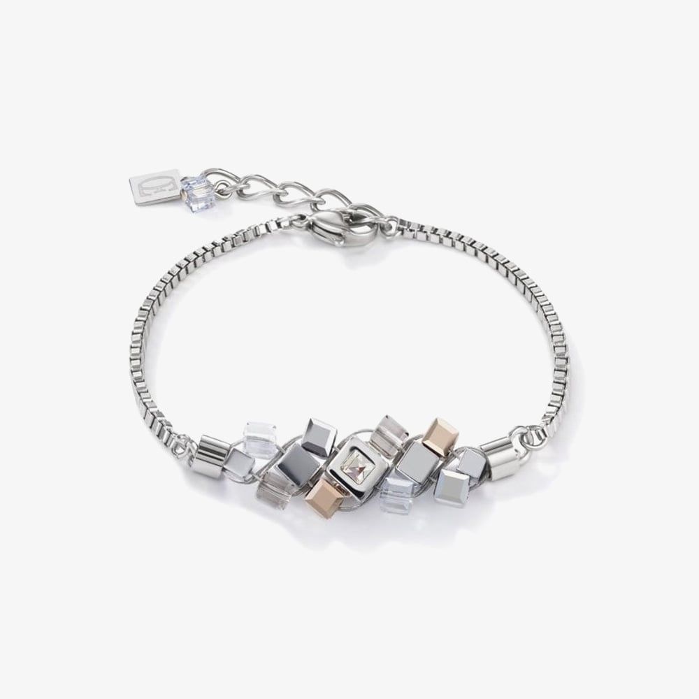 Add a modern touch to your jewellery collection with the Coeur De Lion GeoCUBE Silver Tone Multistone Cluster Bracelet. Crafted on a sleek silver-tone box chain, this striking bracelet features a cluster of GeoCUBE cubes embellished with sparkling Swarovski® crystals and lustrous haematite. Its contemporary geometric design and cool silver tones make it a versatile accessory, perfect for elevating both everyday outfits and special occasion looks.