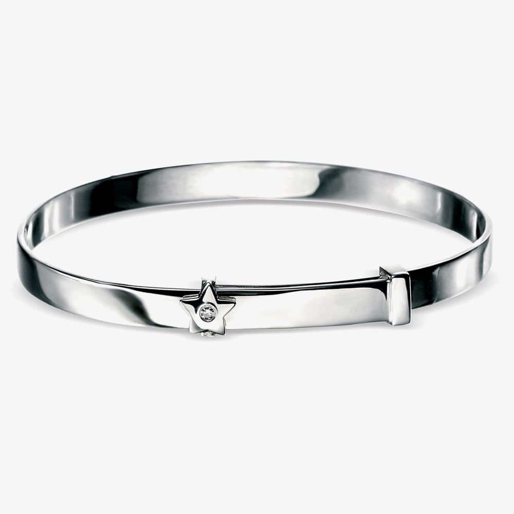 This expandable baby bangle from D for Diamond is crafted in sterling silver and features a star motif set with a single sparkling diamond. A perfect keepsake gift for babies and toddlers.