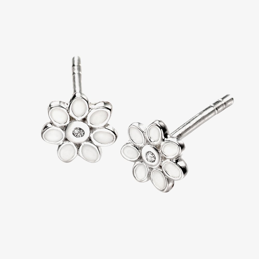 The D For Diamond White Enamel Flower Stud Earrings are a delightful choice for young girls. Crafted from platinum-plated sterling silver, these charming flower-shaped studs feature petals detailed with glossy white enamel and a single sparkling white diamond at the centre. Perfect for adding a touch of sparkle to everyday wear or as a thoughtful gift for a special occasion.
