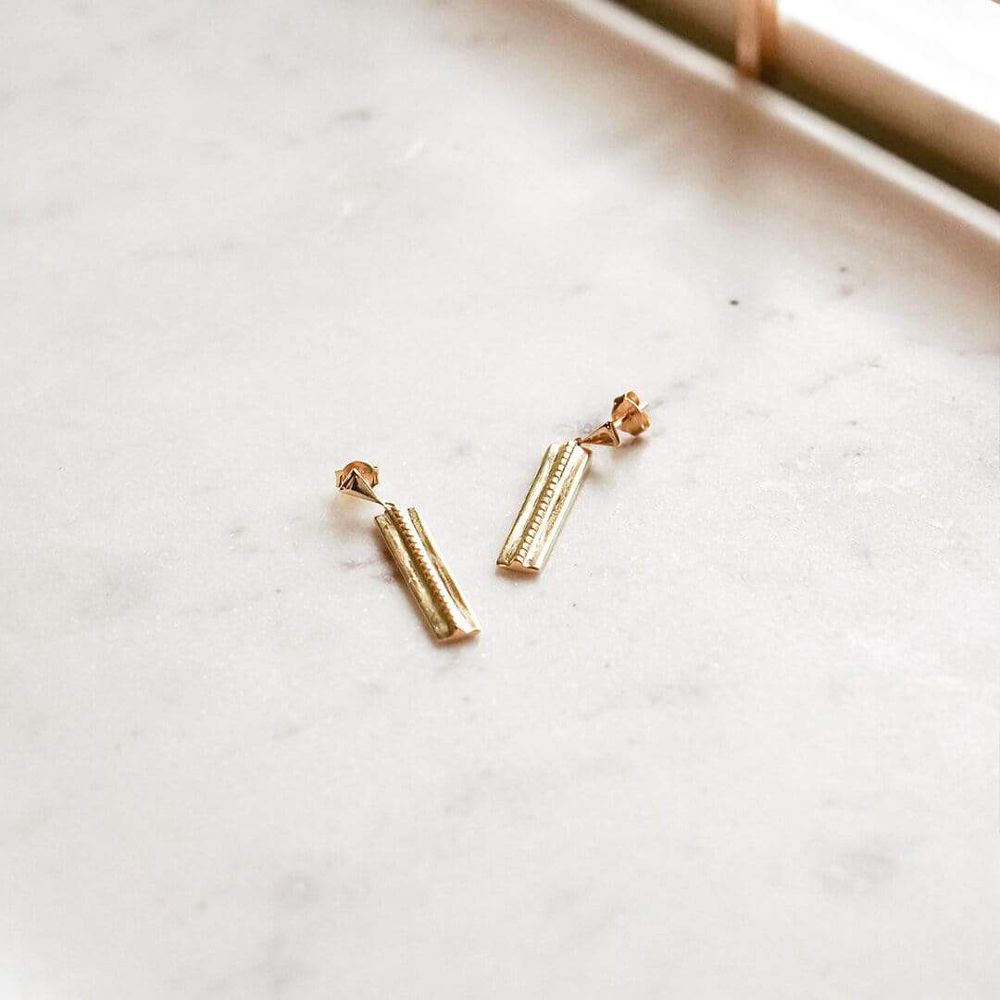 The Daisy London Palms 18ct Gold Plated Palm Ridge Drop Earrings WE12_GP are created in recycled sterling silver with 18ct gold plate and feature raised ridge detailing down the centre of a solid bar. The rectangular charm measures 26.5mm x 5.5mm.