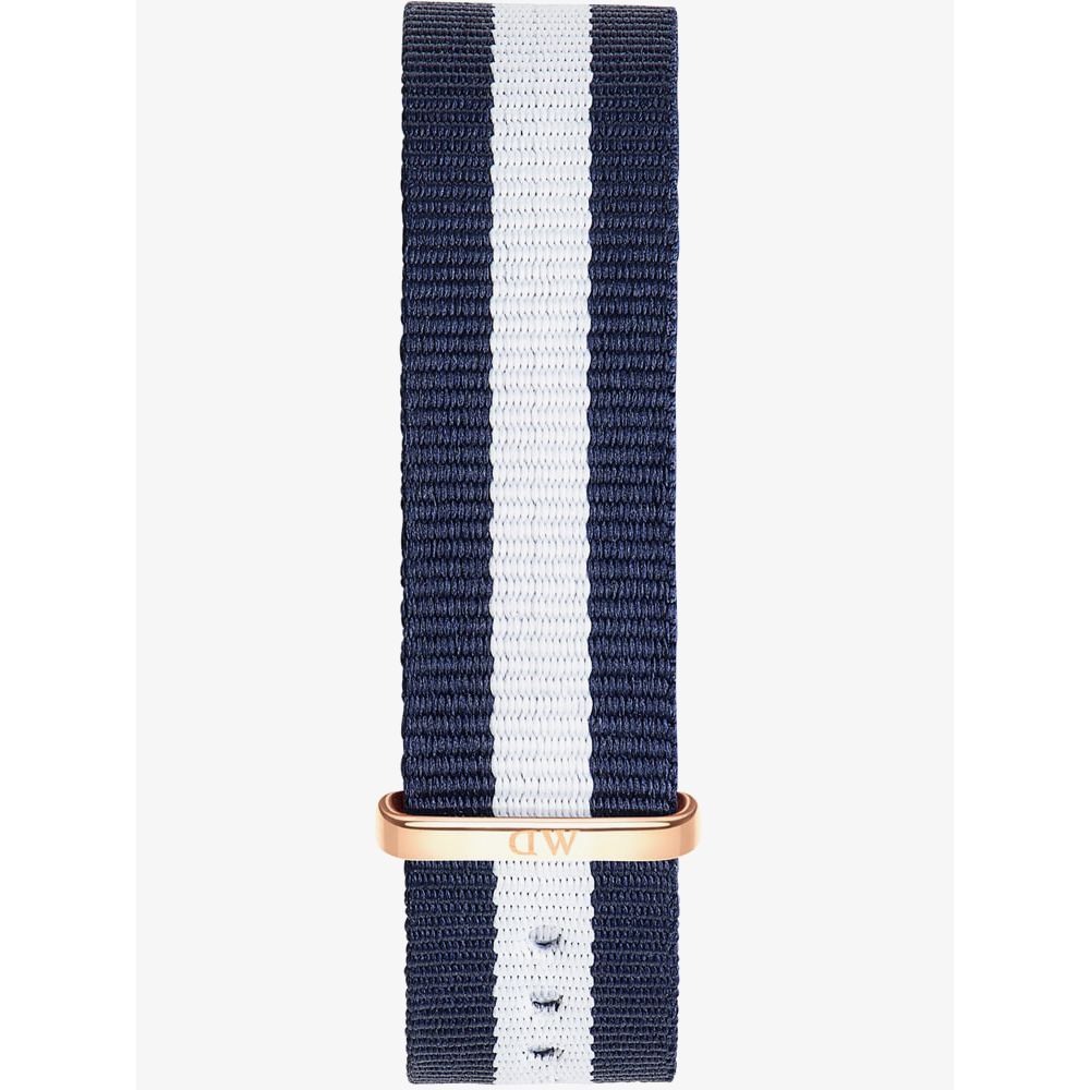 This blue and white fabric watch strap has rose gold tone fastening detail and has a width of 18mm.