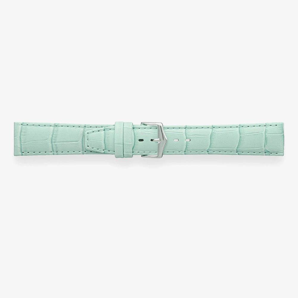 Refine your watch with the Darlena Lulworth Turquoise Leather Strap, expertly crafted from high-quality calfskin with a rich antique croc-embossed finish. The semi-matt texture, rembordé edging and soft nubuck lining ensure both style and comfort, while a silver-tone stainless steel buckle provides a classic, secure fastening.