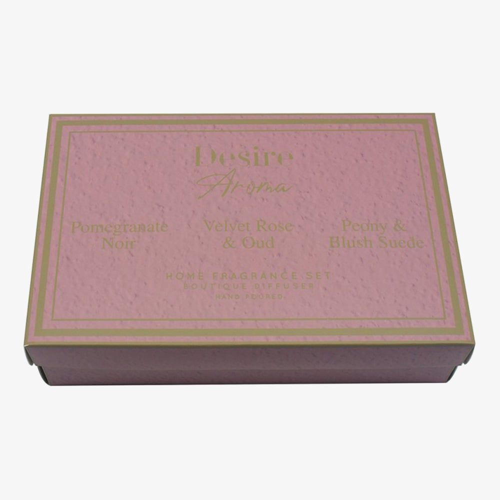 Enhance your space with the Desire Aroma Pink Set Of 3 Reed Diffusers, designed to deliver a floral, continuous fragrance throughout your home. Carefully hand-poured for quality, the scents include Peony & Blush Suede, Velvet Rose & Oud and Pomegranate Noir bringing a fresh and floral atmosphere to any setting. Beautifully presented in a box making it ideal for gifting.