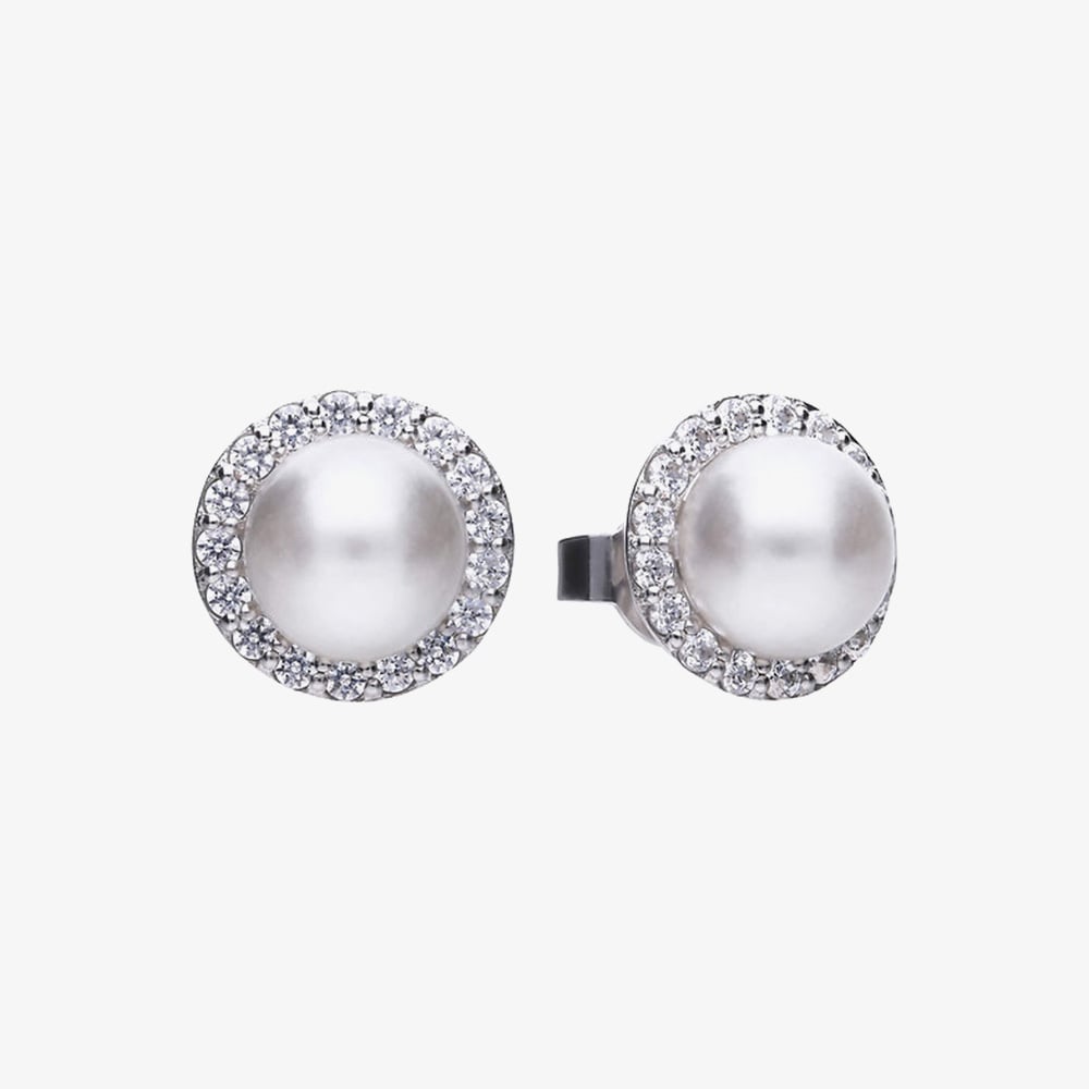 Add timeless elegance with these Diamonfire stud earrings, featuring a lustrous round shell pearl encircled by a sparkling halo of cubic zirconia stones. Crafted in polished sterling silver, they offer a sophisticated and versatile design, perfect for gifting or enhancing any jewellery collection with a touch of refined sparkle.