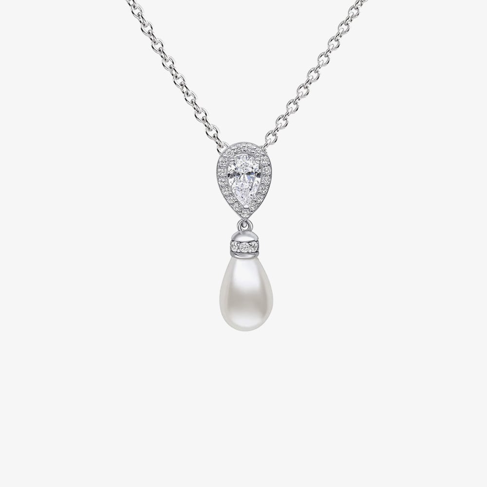 Delicately crafted in sterling silver, this Diamonfire necklace features a teardrop-shaped cubic zirconia surrounded by a halo of sparkling smaller stones. Suspended beneath is a lustrous shell pearl, perfectly complementing the zirconia for an elegant, harmonious design. Completed with an adjustable sterling silver chain, this necklace is a refined piece that adds sophistication to any outfit and makes a thoughtful gift.