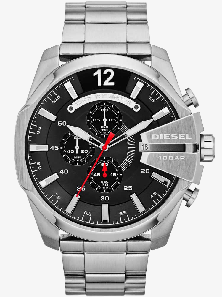 The handsome round black dial features chronograph, date window and silver tone detailing in a fashionable modern style. Diesel bring us this suave looking oversized mens watch set in stainless steel with a sturdy polished and brushed stainless steel bracelet and push button clasp.