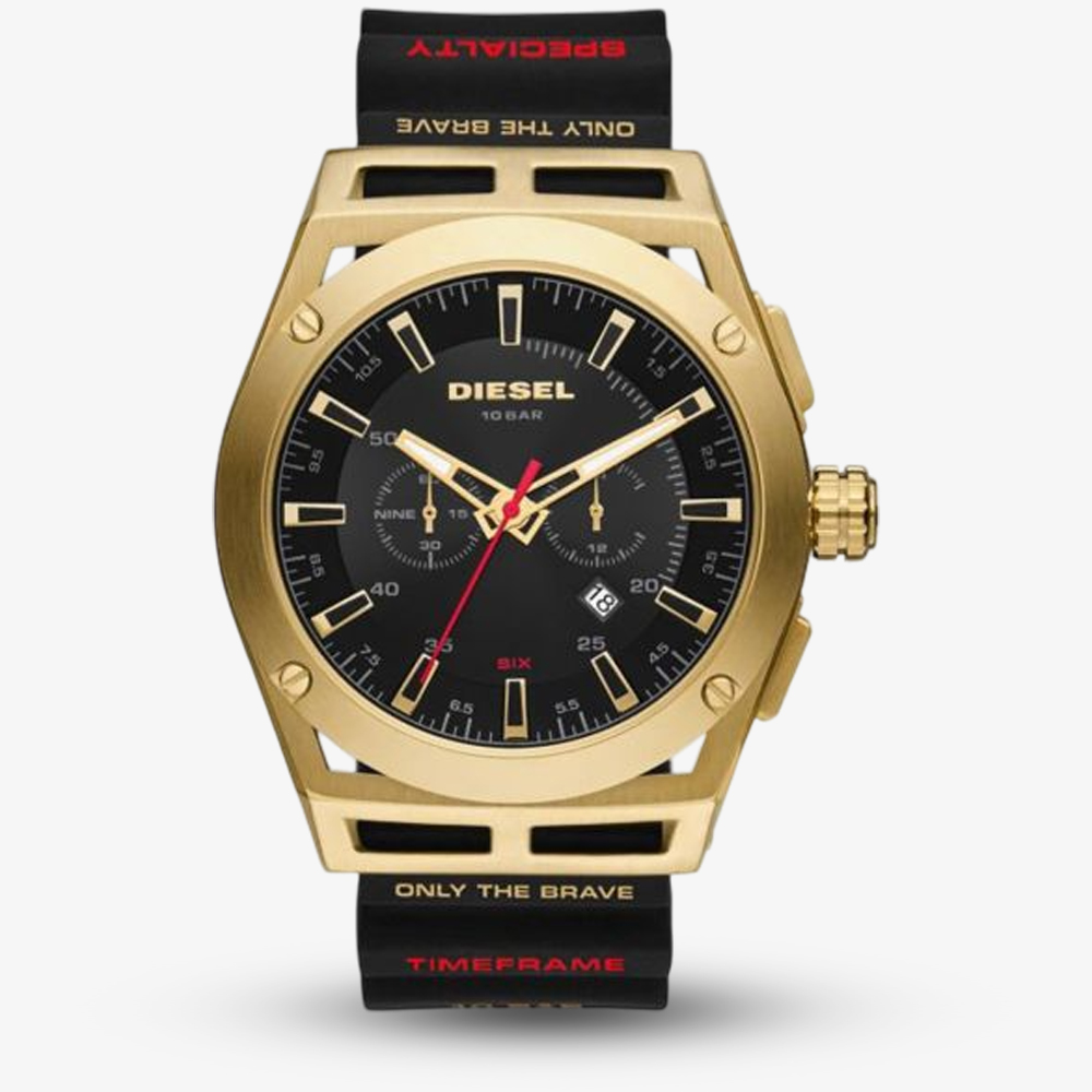 Diesel bring us this stylish Mens Timeframe watch. Featuring a black chronograph display dial with gold tone accents and a gold tone case. It is water resistant up to 100 metres and is completed with a black silicone strap with a traditional buckle fastening.