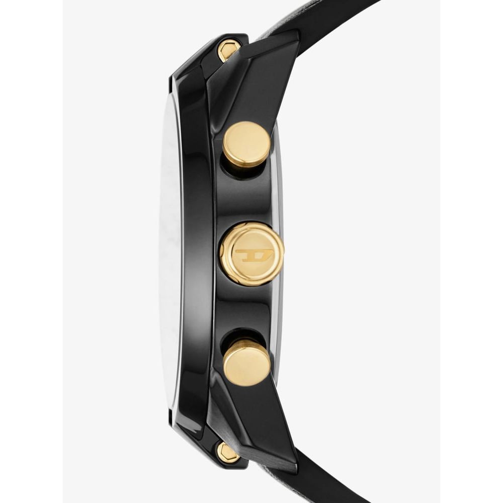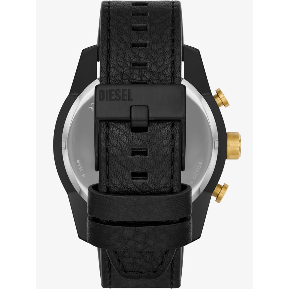 The Diesel Spike DZ4610 watch combines a 51mm round shaped black PVD stainless-steel case and black leather strap with a traditional buckle. It has a black analogue dial with gold-tone luminescent hands, date display & chronograph sub-dials which are protected beneath a mineral crystal glass. Power is generated by the quartz movement. This model also has a water resistance of up to 50 metres.