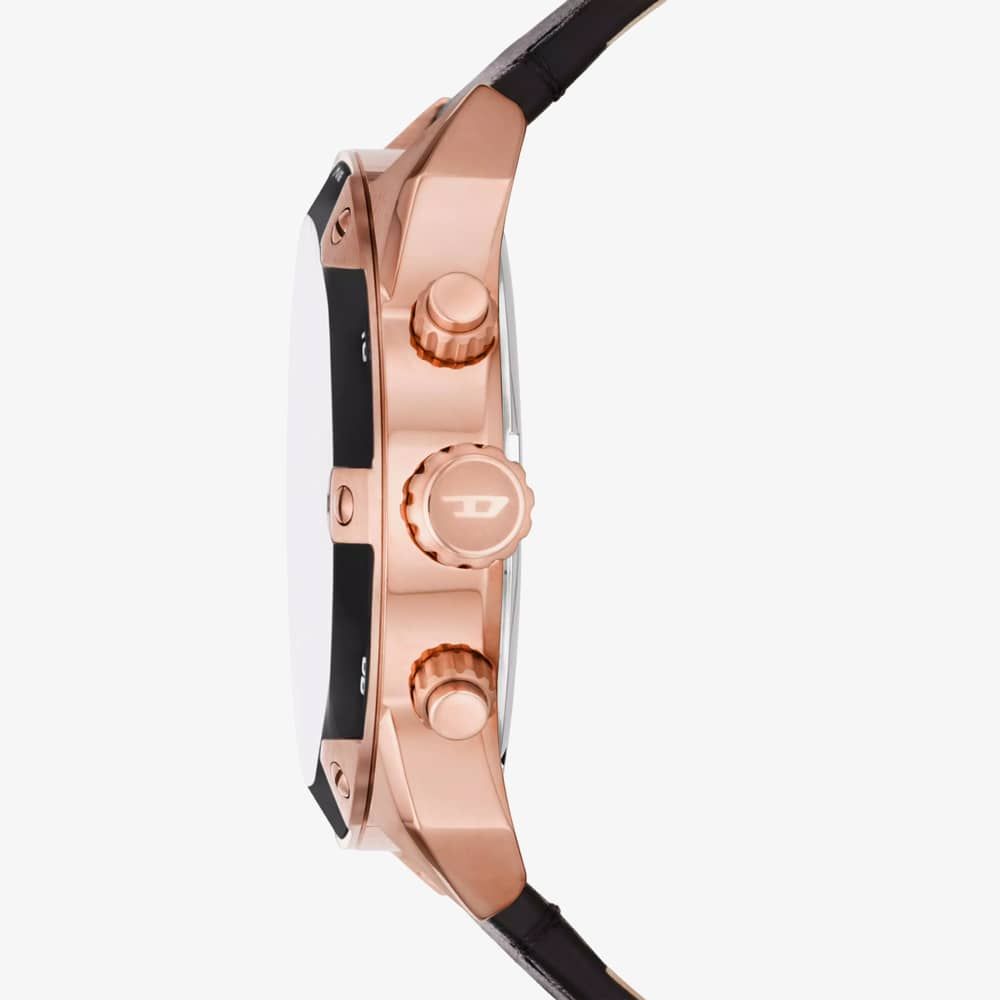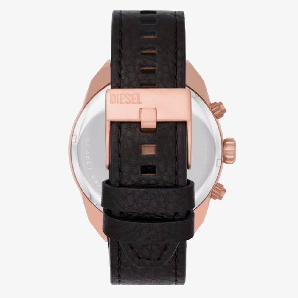The Diesel DZ4607 watch combines a 49mm round-shaped rose gold-plated stainless steel case and black leather strap with a traditional buckle. It has a black sunray analogue dial with rose gold-plated luminescent hands, a date display and three chronograph sub-dials protected beneath mineral crystal glass. Power is generated by the quartz movement. This model also has a water resistance of up to 50 metres.