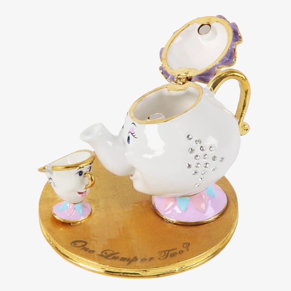 A charming crystal-finished Mrs Potts and Chip trinket box inspired by Disney’s Beauty and the Beast. Set on a gold-finished base with the phrase “One Lump or Two?”, this beautifully detailed piece features sparkling crystals and an opening lid for hidden storage. Secured with a magnetic fastener and presented in a silk-lined Disney gift box, it’s a delightful keepsake for any Disney fan.
