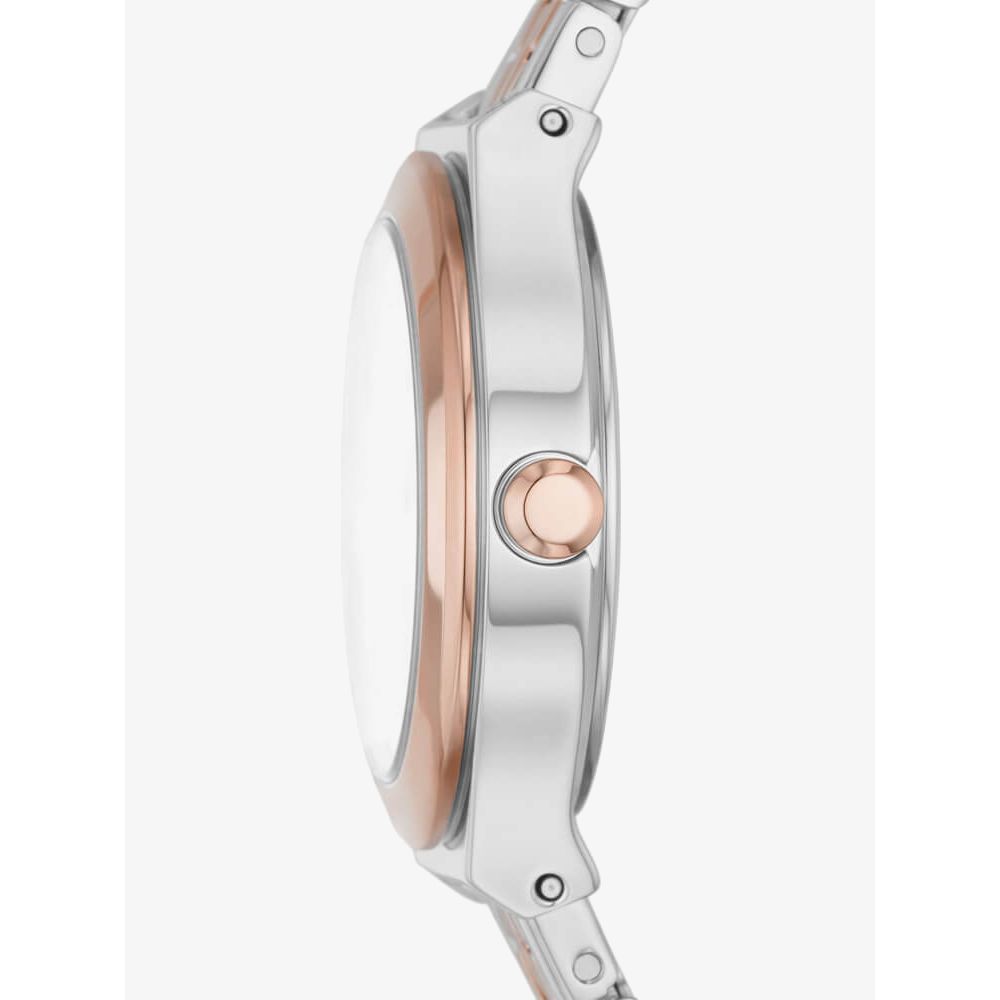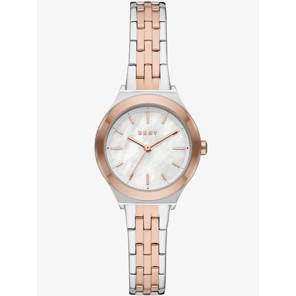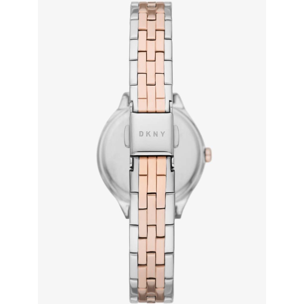 The DKNY Ladies Parsons Watch NY2978 combines a 28mm round shaped stainless steel case and a two tone stainless steel bracelet with a push button deployment clasp. It has a white mother of pearl analogue dial which is protected beneath mineral crystal glass. Power is generated by the quartz movement. This model also has a water resistance of up to 50 metres.