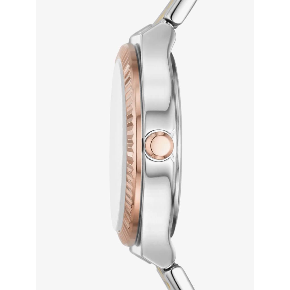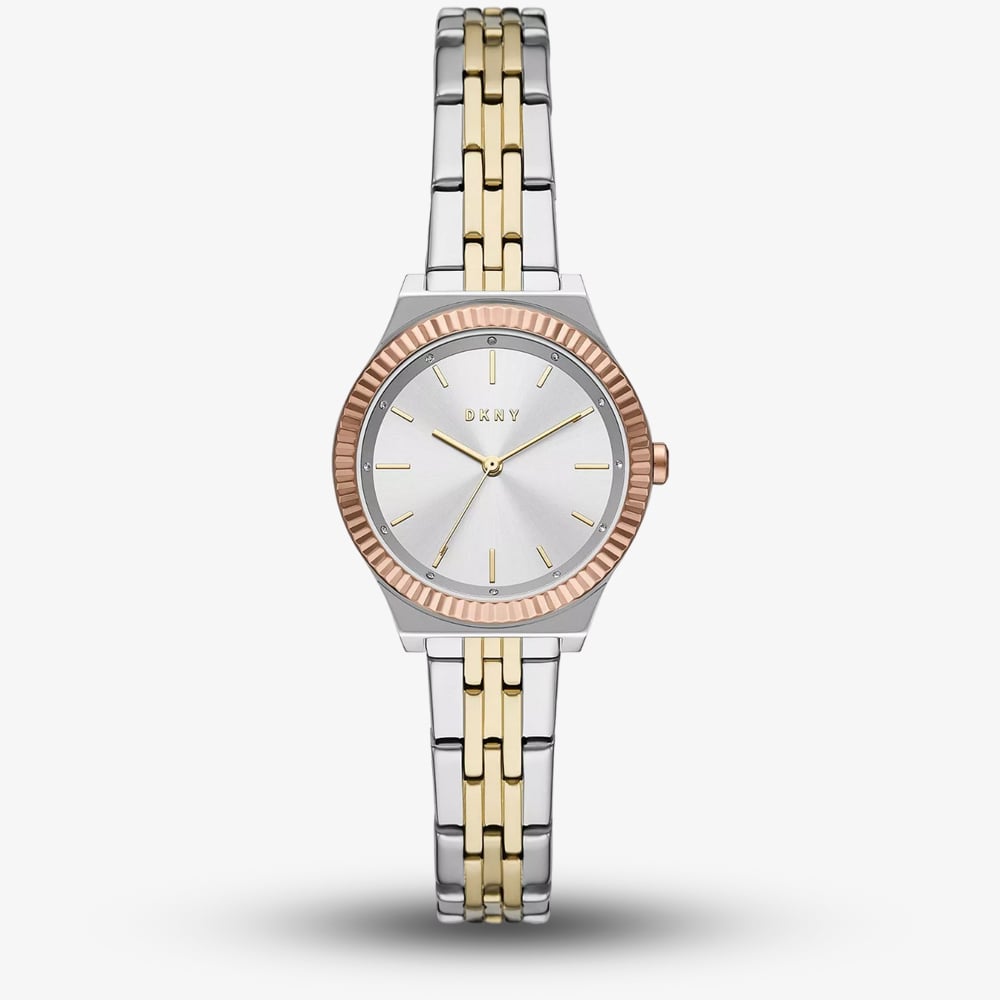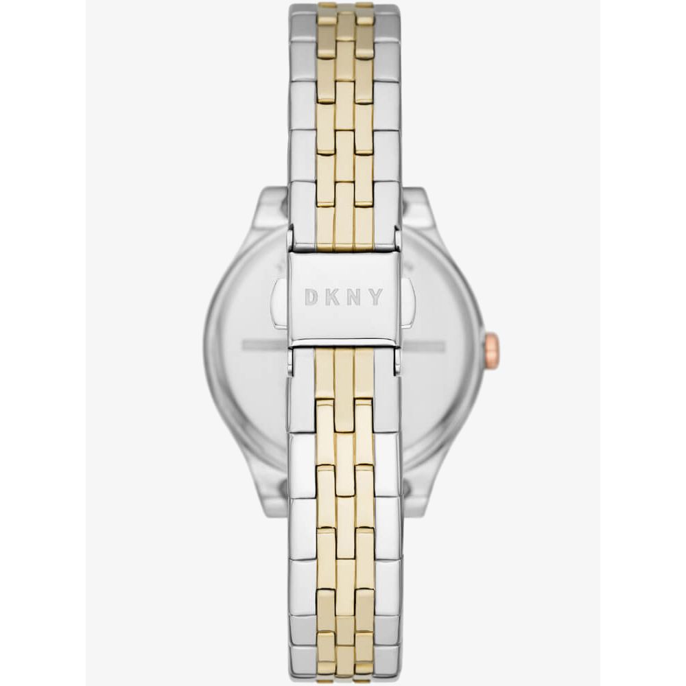 The DKNY Ladies Parsons Watch NY2980 combines a 34mm round shaped stainless steel case and a two tone stainless steel bracelet with a push button deployment clasp. It has a white analogue dial which is protected beneath mineral crystal glass. Power is generated by the quartz movement. This model also has a water resistance of up to 50 metres.