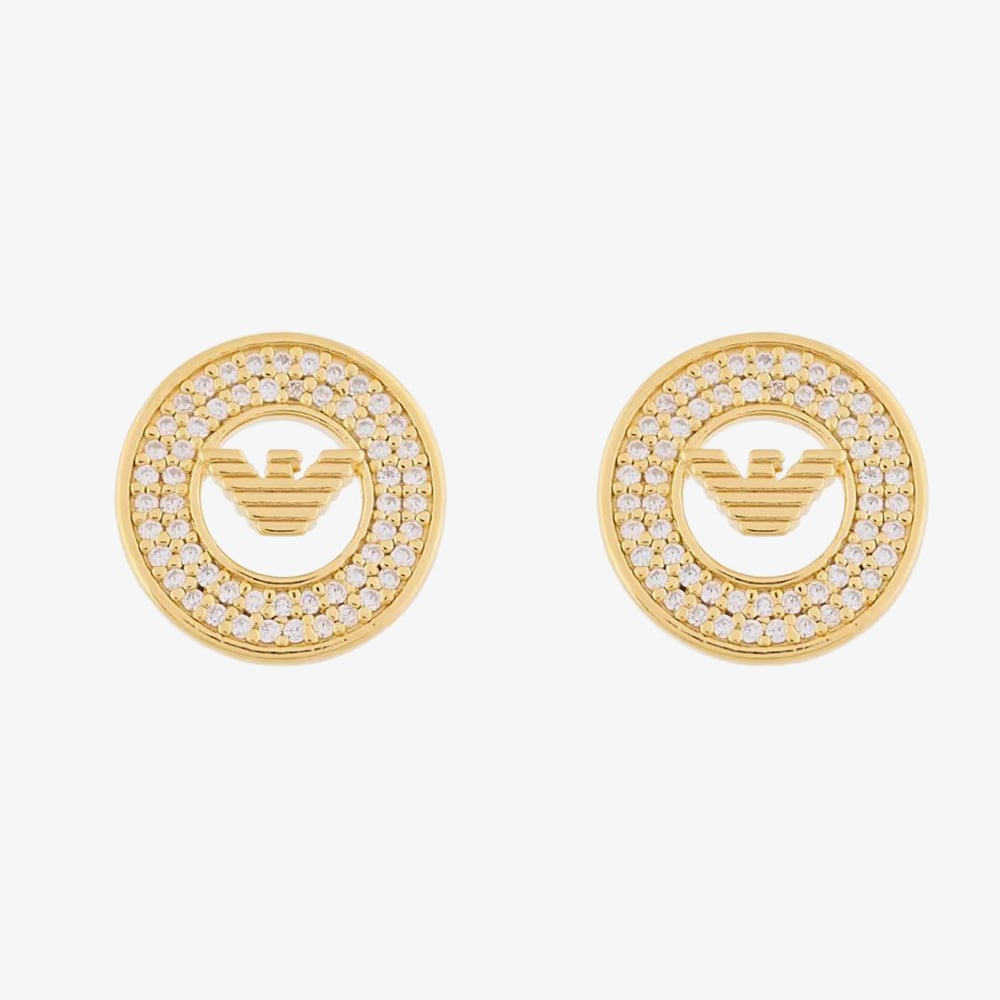 These earrings are crafted from gold-tone sterling silver and feature post closures with elegant stone-set logo detailing. The warm gold finish adds a subtle touch of refinement, making them a versatile staple for any jewellery collection. Thoughtfully designed with quality materials, they reflect the brand’s dedication to exceptional craftsmanship and timeless, understated luxury.