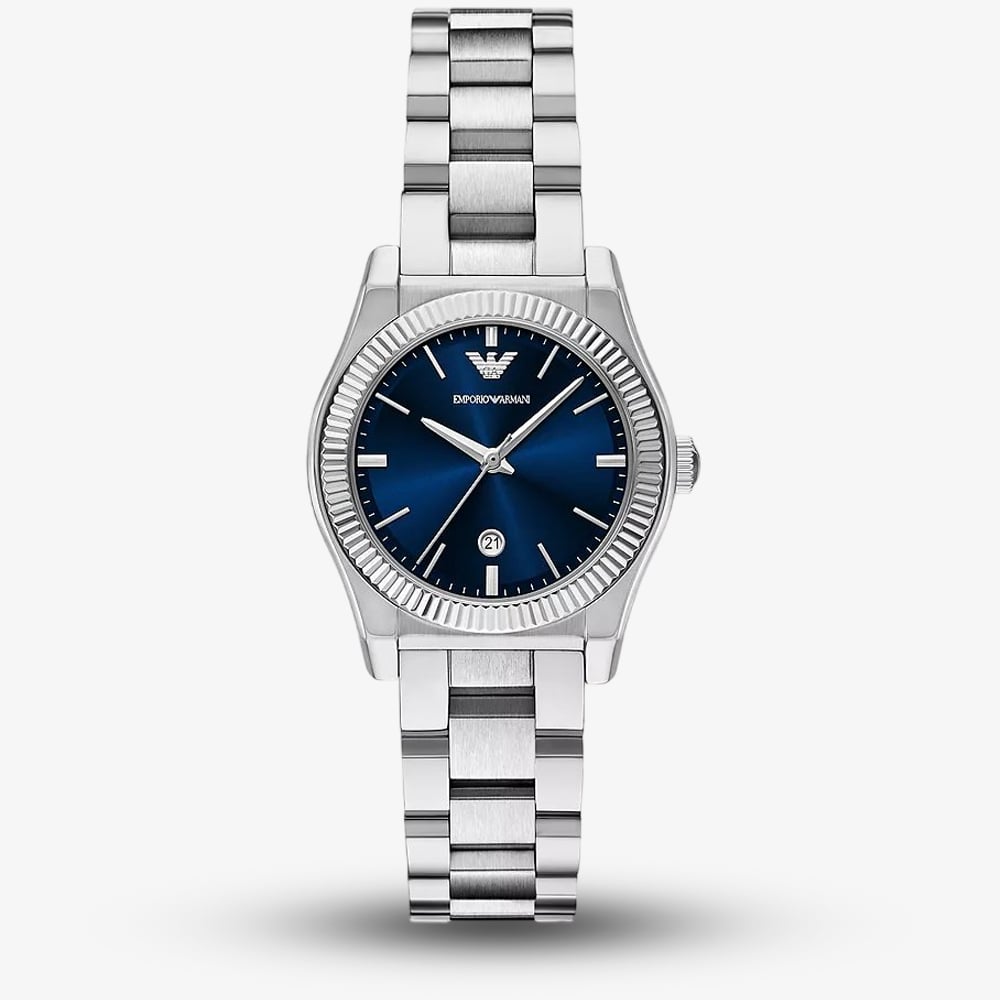 This luxurious watch combines sophisticated design with the precision craftsmanship that defines Emporio Armani. Featuring a matching stainless steel bracelet and case, this watch is the epitome of modern luxury. Its captivating blue dial adds depth and allure, complemented by sleek silver-tone hour markers and the iconic Emporio Armani eagle logo. The minimalist design ensures effortless versatility — perfect for both everyday wear and special occasions.