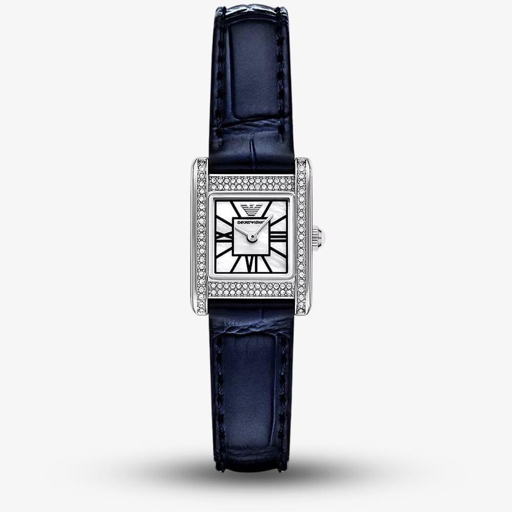 Crafted with precision and style, this beautiful timepiece features a sleek stainless steel case paired with a soft blue leather strap, offering both comfort and luxury in one elegant design. The luxurious mother-of-pearl dial is adorned with subtle Emporio Armani branding and delicate hour markers, giving it a refined and contemporary look suitable for any occasion. Whether you’re dressing for formal or casual occasions, this watch adds a touch of understated glamour to any ensemble.