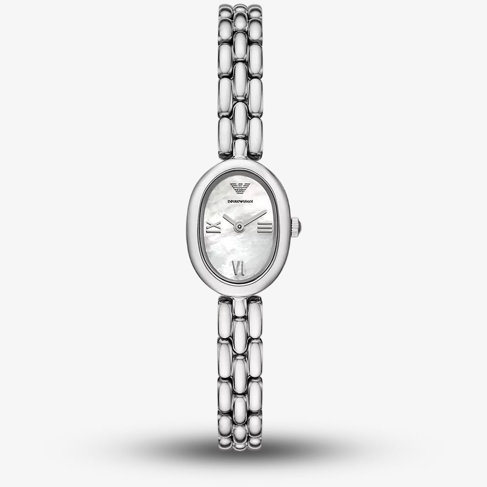 This exquisite timepiece blends timeless craftsmanship with contemporary Italian style. The watch features a polished silver-tone stainless steel bracelet and case, offering a sleek and luxurious feel. The mother-of-pearl dial shimmers beautifully, enhanced by the iconic Emporio Armani logo. Subtle yet striking, this watch is the perfect example of understated glamour that transitions effortlessly from day to evening wear.