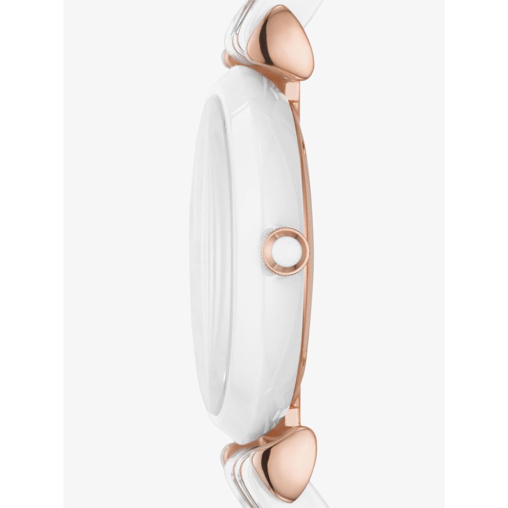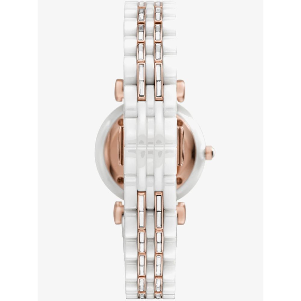 This luxurious Ladies' watch is bought to us by Emporio Armani. Featuring stainless steel and ceramic case, housing a white mother-of-pearl dial with rose gold-tone accents. It is completed with a two-colour ceramic bracelet encrusted with clear baguette cut stones with rose gold-tone accents and a push button deployment clasp.