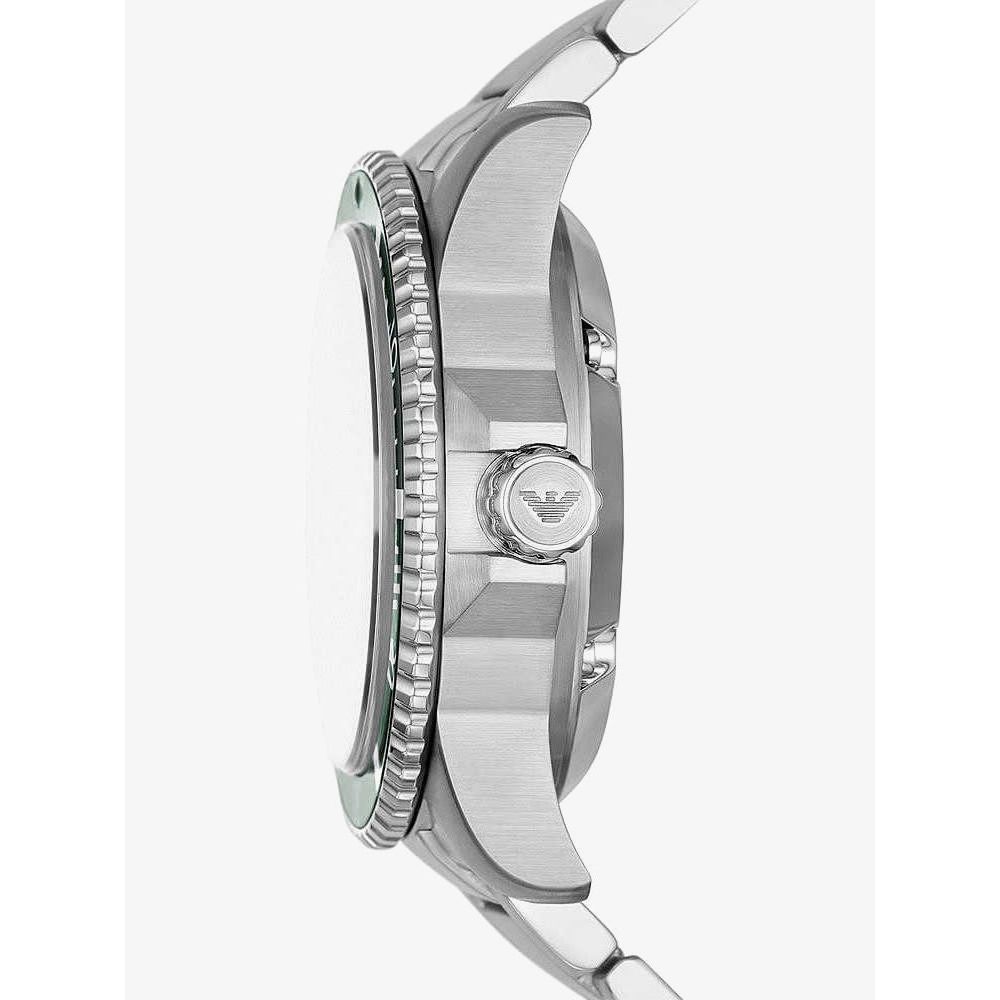 The Emporio Armani Meccanico AR60061 watch combines a 42mm round shaped 50% recycled satin finished stainless-steel case and a 50% recycled stainless-steel bracelet with a push button deployment clasp. It has a skeleton & green open wave design analogue dial with luminescent hands which are protected beneath a mineral crystal glass. Power is generated by the automatic movement. This model also has a water resistance of up to 100 metres.