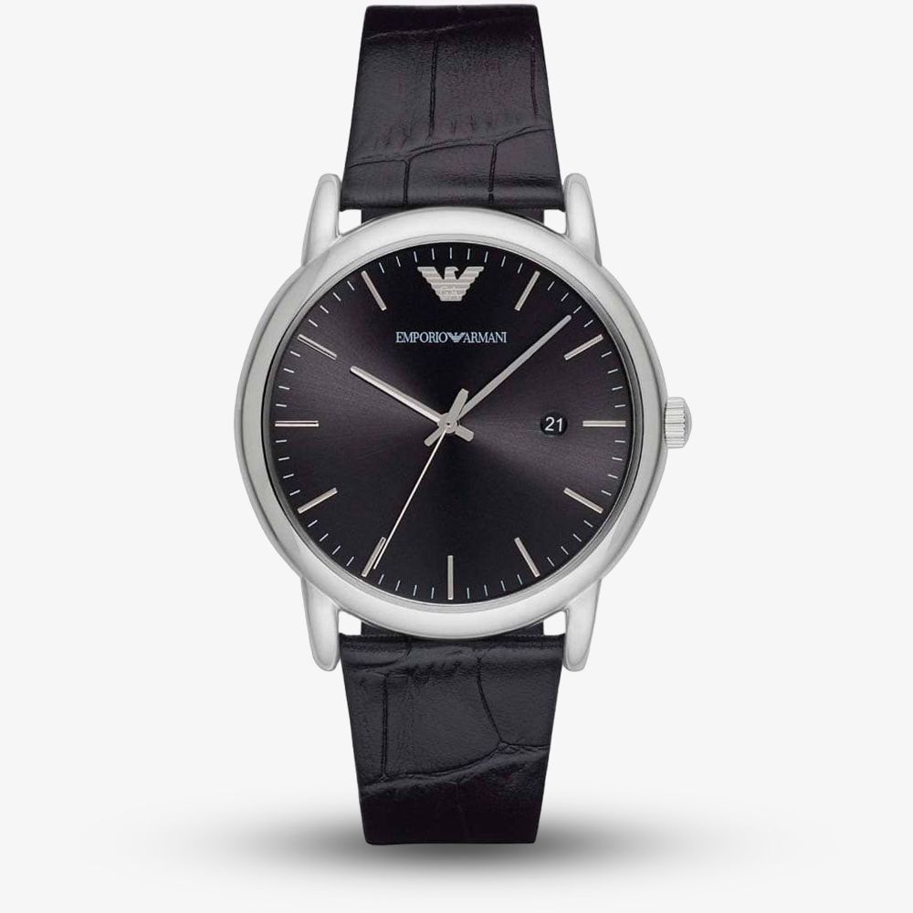 Direct from Emporio Armani comes this stylish men's timepiece, featuring a black genuine leather strap which connects to the stainless steel casing. The round black dial showcases the 12 hour analogue display using slim fitting hands and hour markers. A date window has also been added to increase overall functionality.