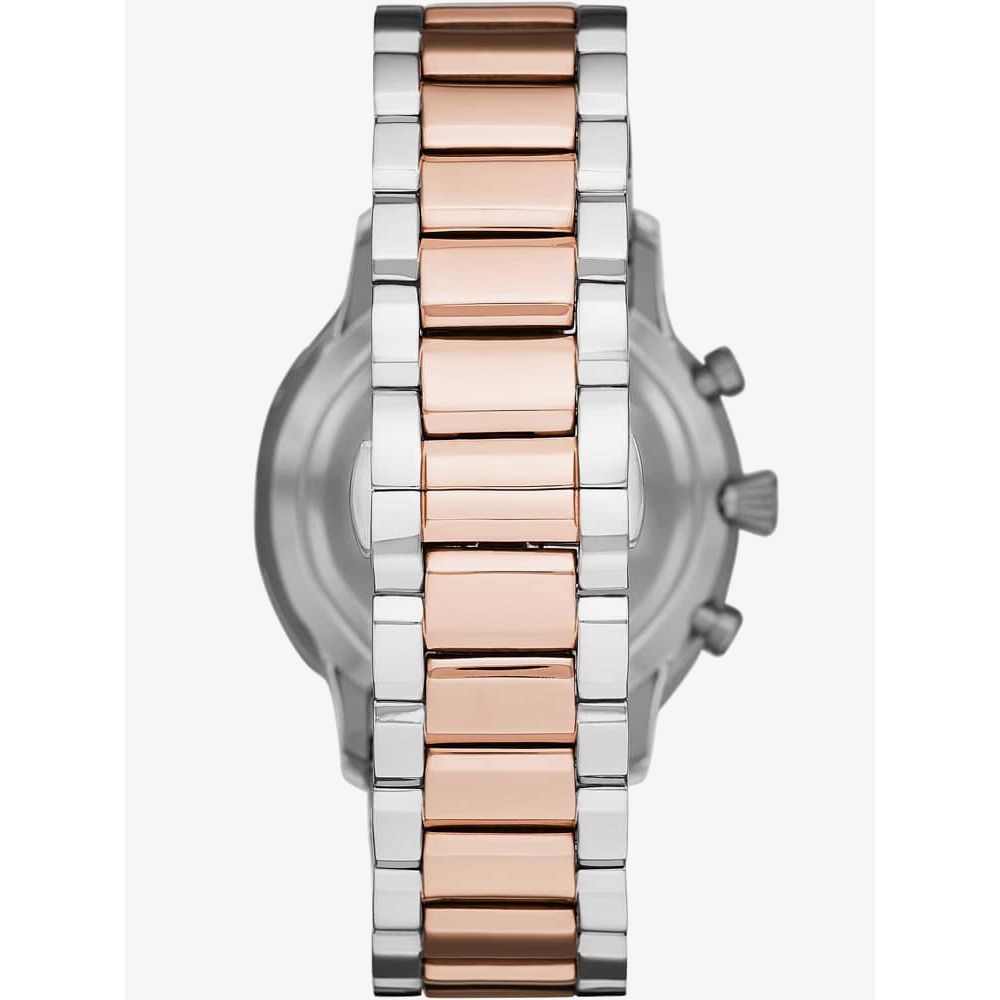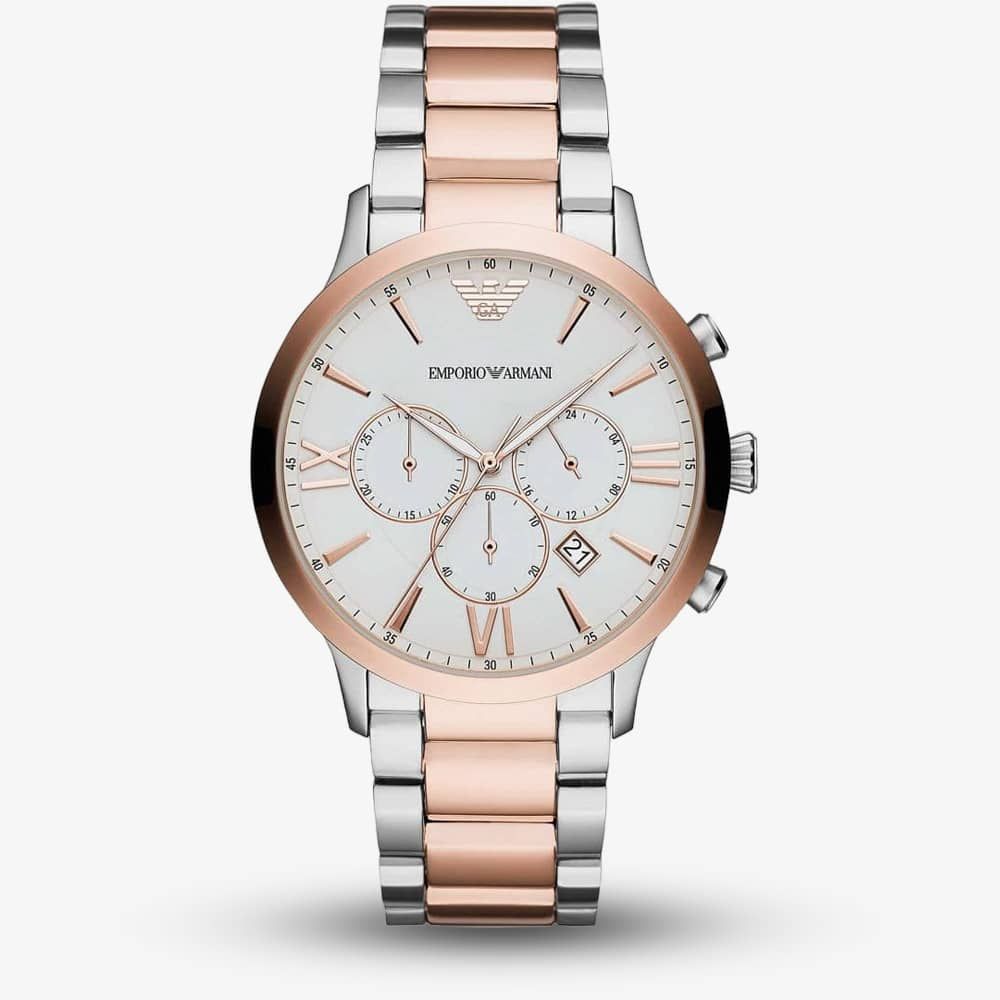 Featuring an eye catching two tone design, this stunning chronograph watch is the perfect accessory for adding a smart finish to your everyday look. Crafted in stainless steel, the watch features rose gold plated accents. The crisp white dial is adorned with rose gold hour markers, a date window at 4 o'clock and the iconic Emporio Armani eagle logo at 12 o'clock. The watch is finished with a stainless steel bracelet and a deployment clasp fastening.