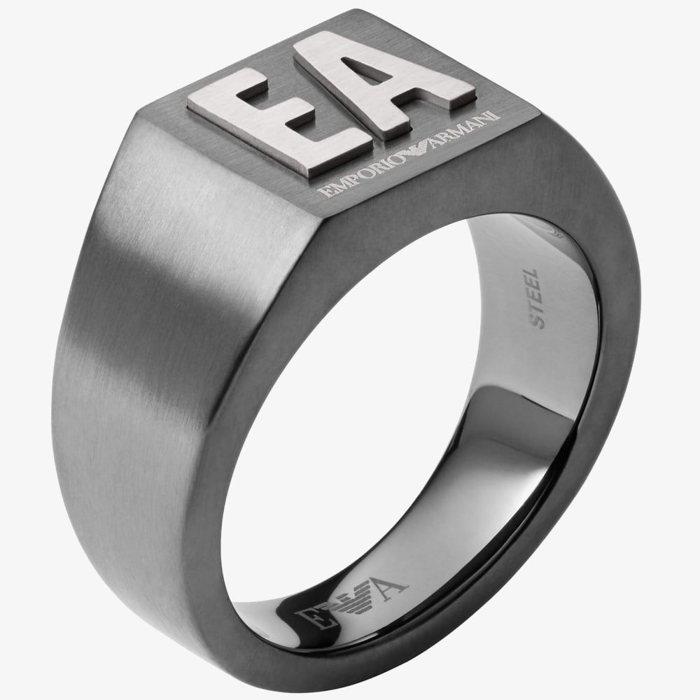 Created in gunmetal Stainless Steel, this Mens logo design signet ring is bought to us by Emporio Armani.