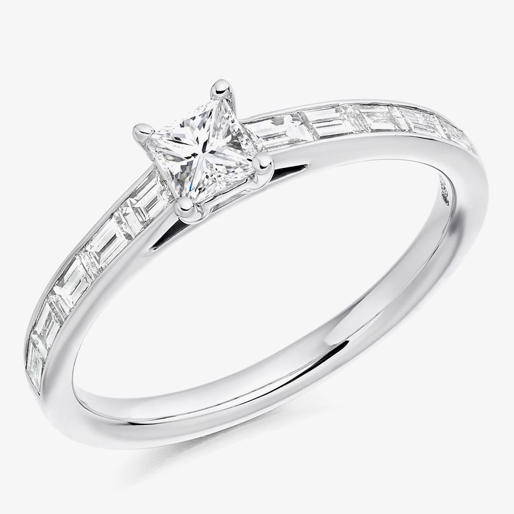 Offering unique design and classic beauty with lots of sparkle perfect for any bridal set, the Platinum Princess-Cut Diamond-Shoulder Engagement Ring (M) features a 0.33ct princess-cut centre diamond in a claw setting and 0.40ct of baguette-cut shoulder diamonds in channel setting. Set on a platinum 950 band, this solitaire engagement ring with diamond encrusted shoulders is set to make sure you get a 'yes' and would pair beautifully with an eternity ring. Available in UK size M.