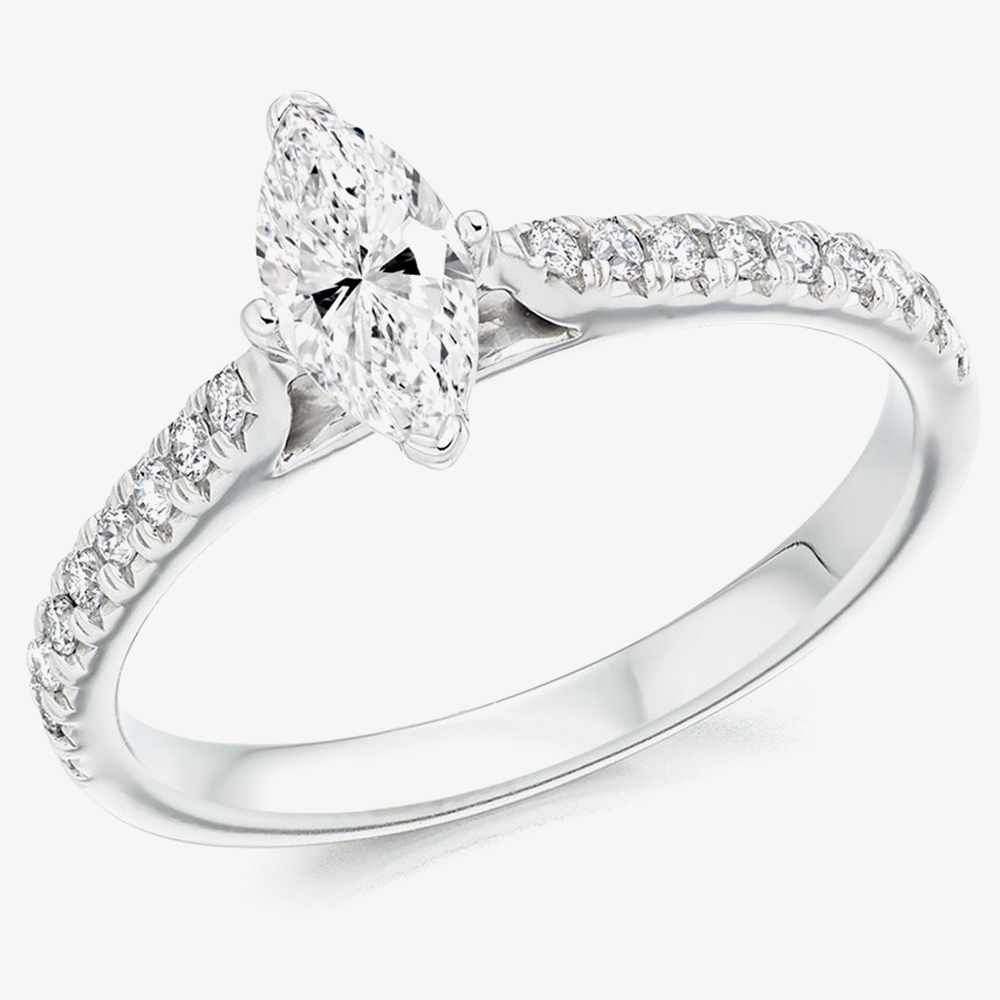 Offering an eye-catching, stunning addition to any bridal set with lots of sparkle, the Platinum Marquise-Cut Diamond-Shoulder Engagement Ring (L) features a 0.40ct marquise cut centre diamond in a claw setting and 0.20ct of round-brilliant cut shoulder diamonds in a micro-claw setting. Set on a platinum 950 band, this solitaire engagement ring with diamond encrusted shoulders is set to make sure you get a 'yes' and would pair beautifully with an eternity ring. Available in UK size L.