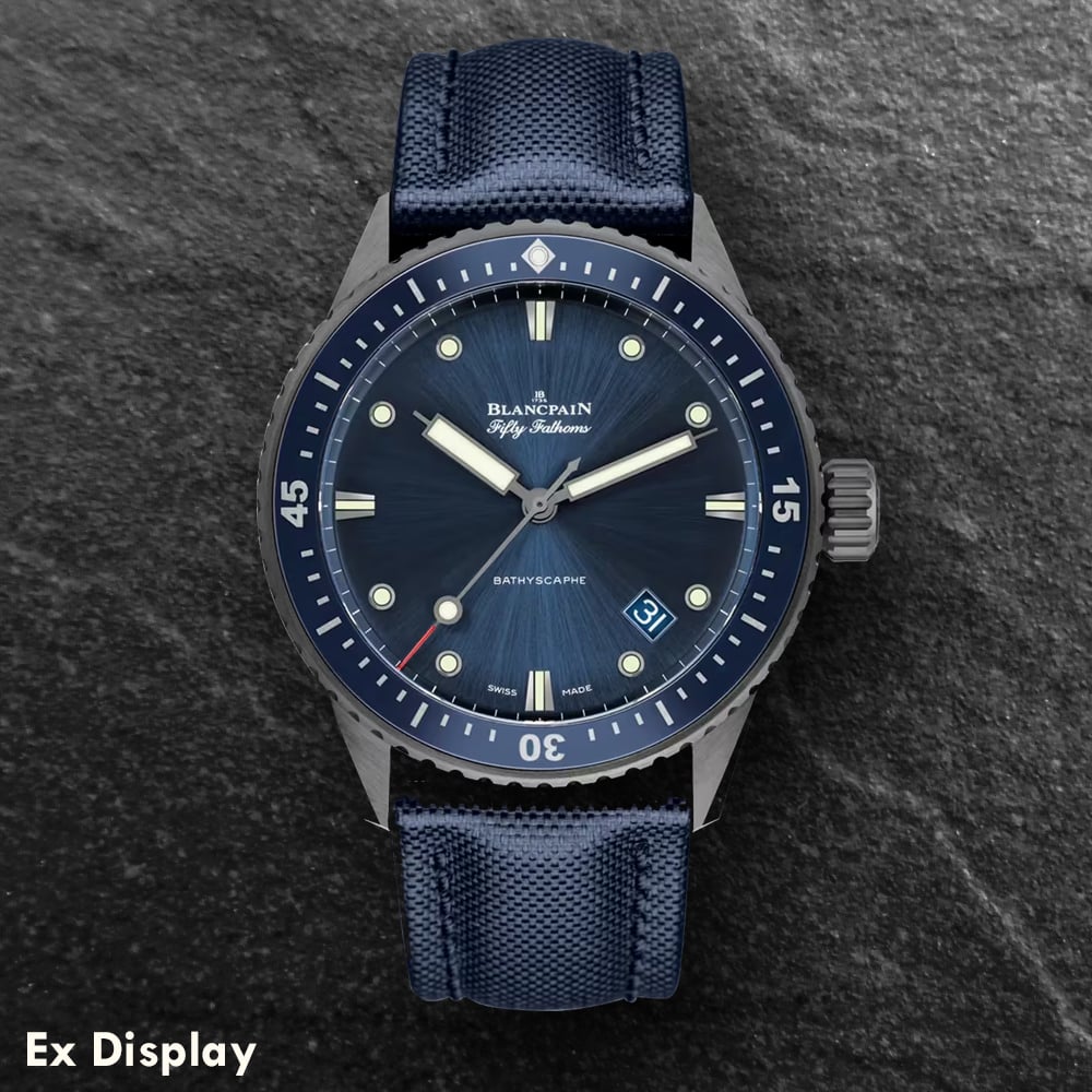 Blancpain’s desire to catalyse technical innovations to aid in the exploration of the marine world gave rise to the Fifty Fathoms collection, some of the finest dive watches ever made worn by the legendary oceanographer Jacques Cousteau. A robust satin-brushed grey ceramic case and scratch resistant sapphire crystal allow for an exceptional water resistance of 300m and with a power reserve of 120 hours, this watch is extremely durable. The brushed blue dial has a date function at 4.30 and is pointed to by white luminescent baton hands and white luminescent hour markers indicate the hours. The face is finished with a blue ceramic unidirectional bezel marked with minutes and it’s all fastened with a blue sail-canvas strap with pin buckle.