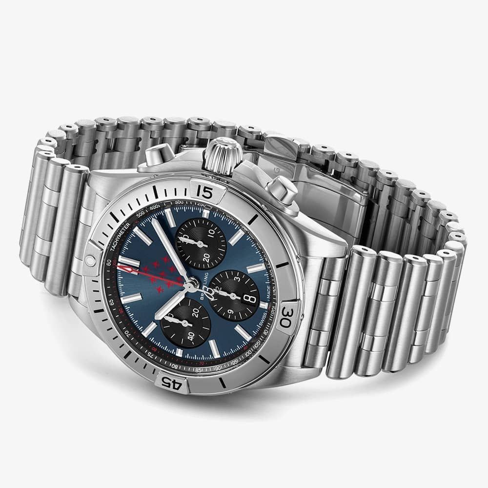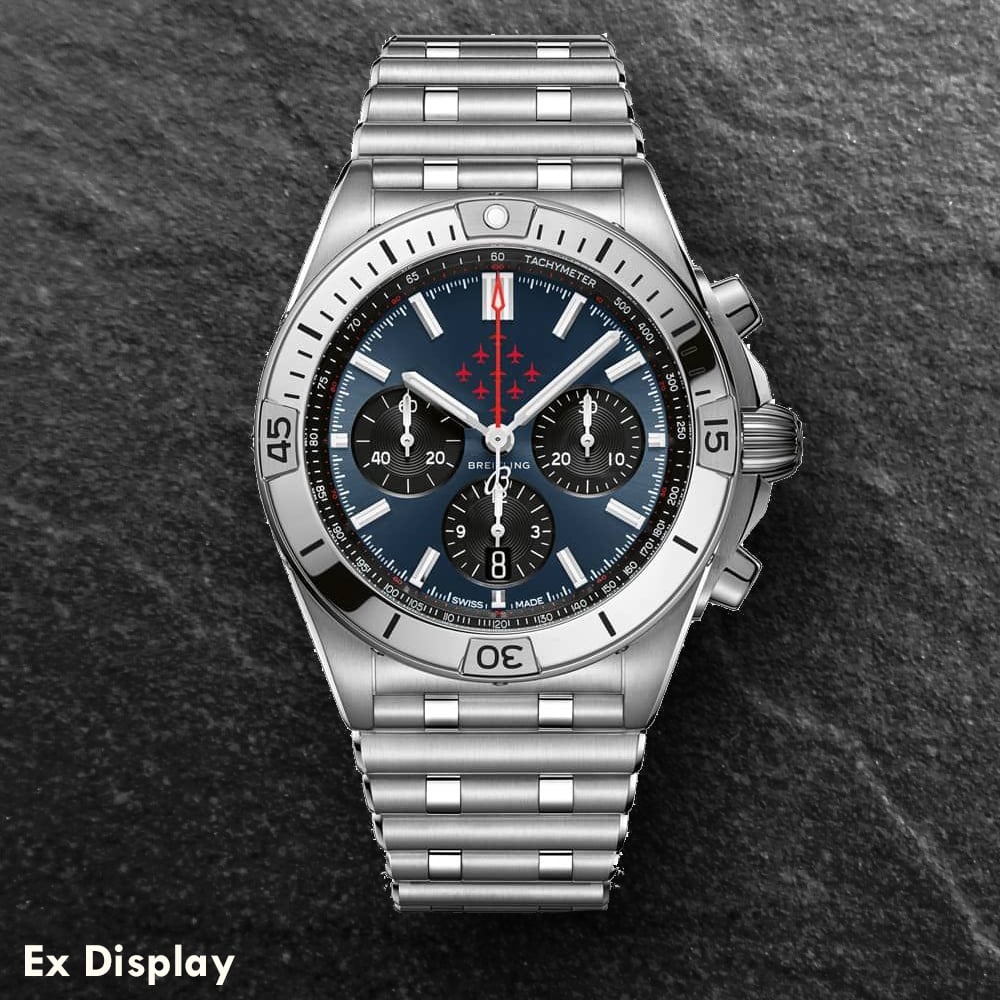 A Breitling Chronomat watch paying tribute to the Red Arrows and limited to just 160 pieces worldwide. It combines a 42mm stainless steel case and Rouleaux link bracelet with a push button deployment clasp. It has a blue dial with the Red Arrows flying in their Diamond Nine formation which is protected beneath cambered sapphire crystal glass with glareproofing applied on both sides. This model also has a tachymeter, chronograph sub-dials, luminescent dial hands, and a date display. Powering the watch is the Breitling 01 Calibre automatic movement which can be seen through the transparent sapphire crystal case back. It also has a water resistance of up to 200 metres.