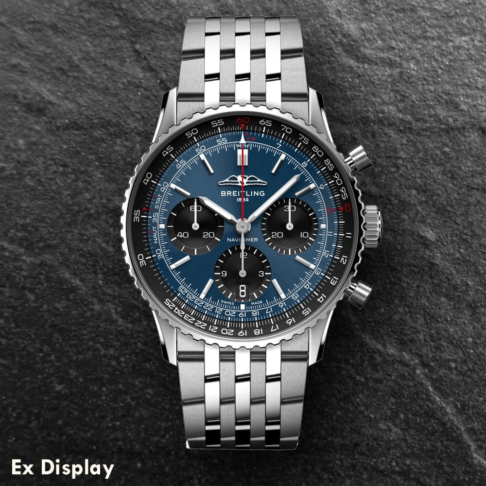 The Breitling Men’s Navitimer B01 Blue Chronograph Watch AB0139241C1A1 combines a 41mm round-shaped stainless-steel case and silver stainless-steel bracelet with a push button deployment clasp. It has a blue analogue dial with three black chronograph sub-dials and a black bezel tachymeter. The date is visible in the centre of the second sub-dial. There are two silver luminescent hands with a red second tracker which is protected beneath cambered sapphire crystal glass, glare-proofed on both sides. Power is generated by Breitling 01 Automatic movement, with a power reserve of approximately 70 hours. This model also has a water resistance of up to 30 metres.