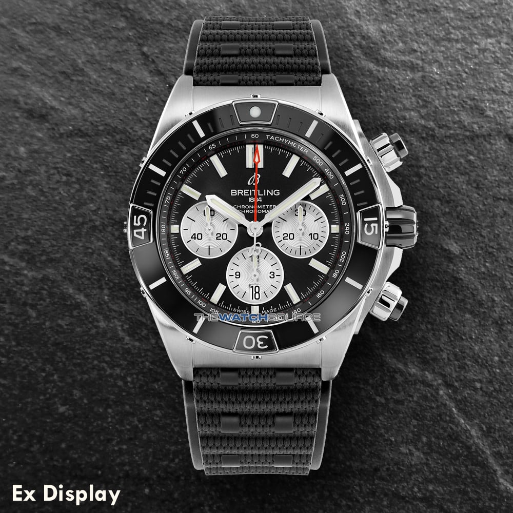 The Breitling AB0136251B1S1 Super Chronomat B01 44 watch combines a 44mm round shaped stainless steel case and black rubber strap with a fold over clasp. It has a black analogue dial with Superluminova coated hands, a date display, chronograph sub-dials, and tachymeter scale, all of which is protected beneath cambered scratch resistant sapphire crystal glass with glare-proofing applied on both sides. Power is generated by the COSC certified Breitling Manufacture Calibre 01 automatic movement with a power reserve of approximately 70 hours made from 346 components. This model also has a water resistance of up to 200 metres (20 bar of pressure).