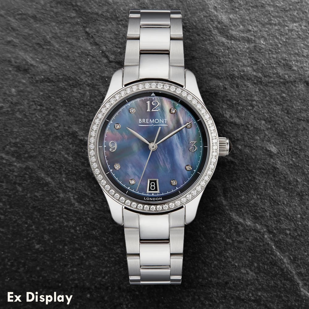 The Bremont Solo Lady K Tahiti watch combines a 34mm round shaped polished stainless steel case with Bremont Trip-Tick construction and scratch resistant DLC treated barrel case, and comes on a 16mm wide stainless steel bracelet with a double push button clasp. It has a black Tahitian mother of pearl analogue dial with a date display and 8 claw set full cut VS2 GH diamond hour markers, all of which is protected beneath domed scratch resistant sapphire crystal glass with an anti-reflective coating. Power is generated by the modified calibre 11 1/2’’’ BE-92AV automatic chronometer movement with 25 jewels and a 42 hour power reserve. This model also has a flat exhibition crystal case back and a water resistance of up to 100 metres.