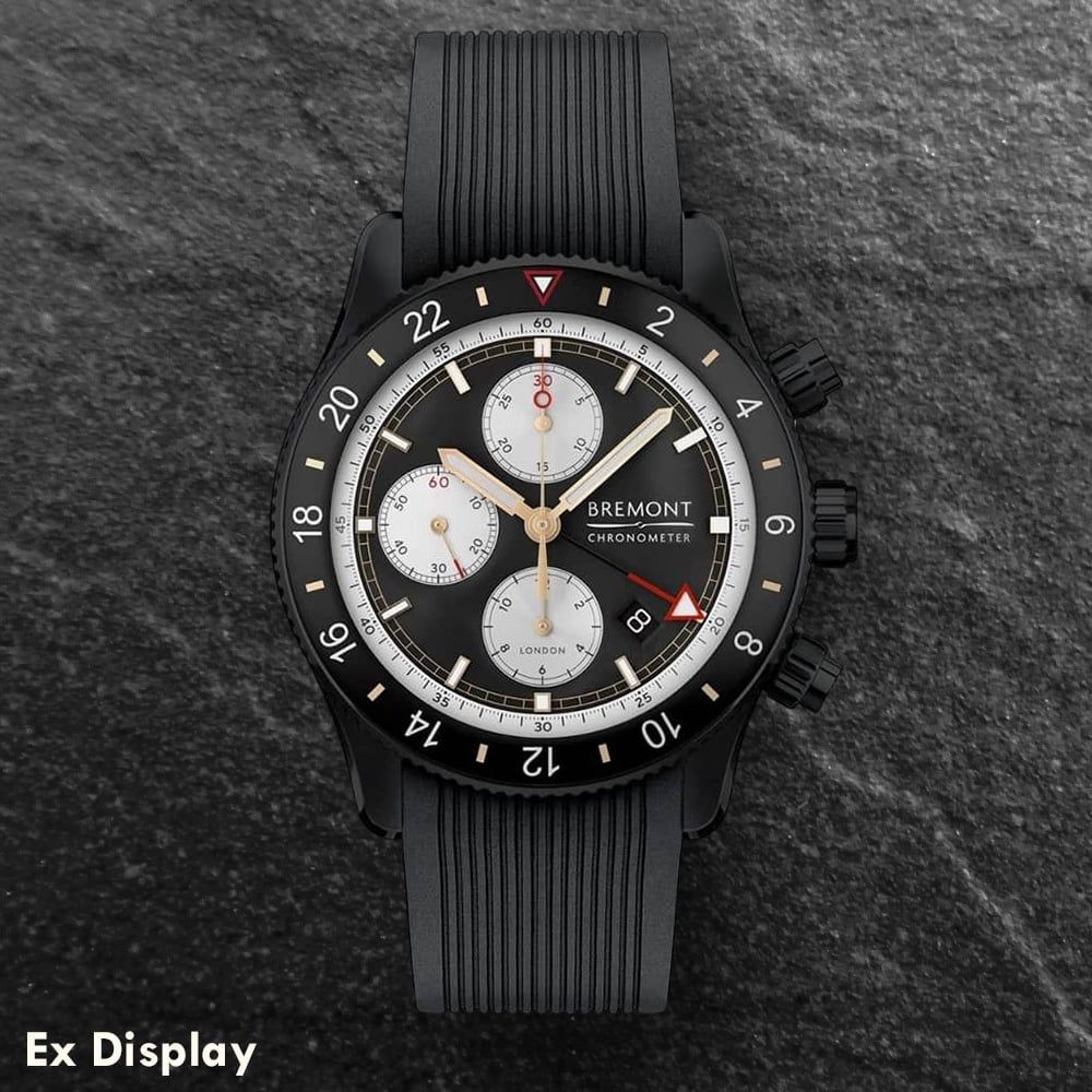 The Bremont Mens Supermarine Black rubber Strap Watch SMARINECHRONO-JET-R-S watch combines a 43mm round shaped jet treated stainless steel case and black rubber strap with a traditional buckle . It has a black analogue dial with luminescent hands, date display, chronograph sub-dials which is protected beneath somed anti-reflective, scratch resitant sapphire crystal glass. Power is generated by the automatic movement which has a power reserve of 42 hours. This model also has a water resistance of up to 200 metres.