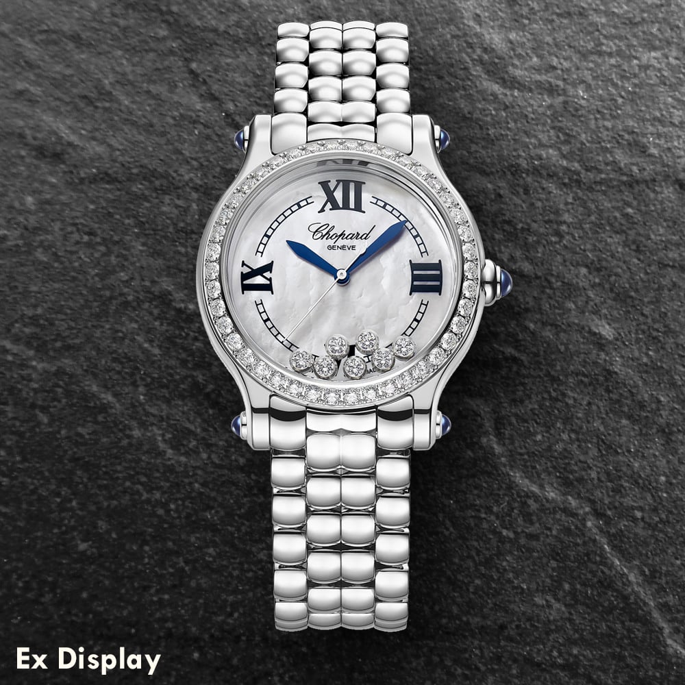 Giving you the best of classic style with some glitz and glamour in one luxury watch, the Happy Sport Geneve Mother of Pearl Diamond Watch offers style and statement for every occasion big or small. Situated on a stainless steel 4-link bracelet with a fold-over clasp, the mother of pearl dial features a Chopard logo detail, navy and silver three-hand display, navy roman numeral indexes, and 7 genuine diamonds set beneath the glass. Encased in a 33mm dial case embezzeled with genuine diamonds and fitted with glareproof scratch-resistant sapphire glass, the watch also features a blue diamond on the crown of the watch, the watch operates on Swiss-Made self-winding movement and is water resistant to 30m, making it a must have.