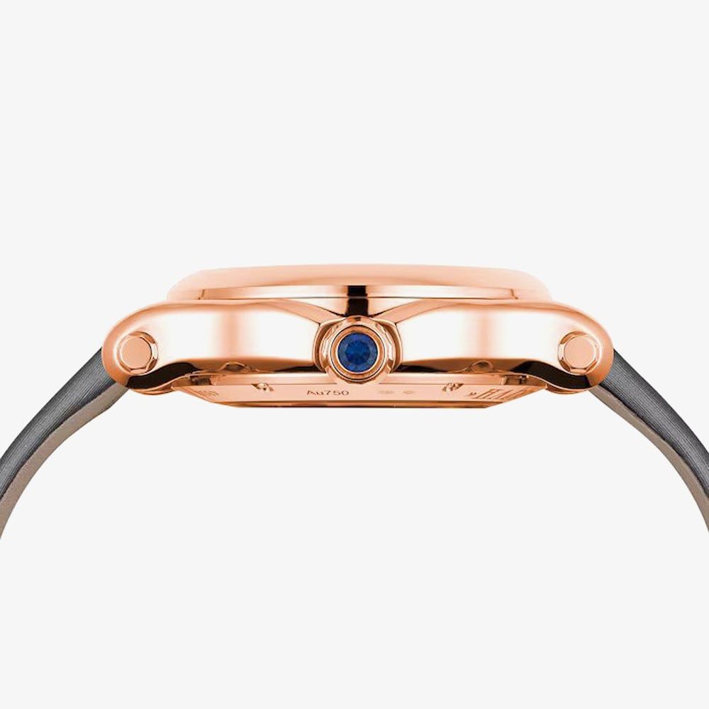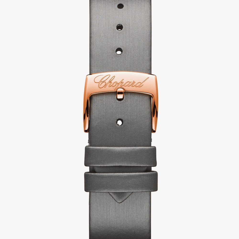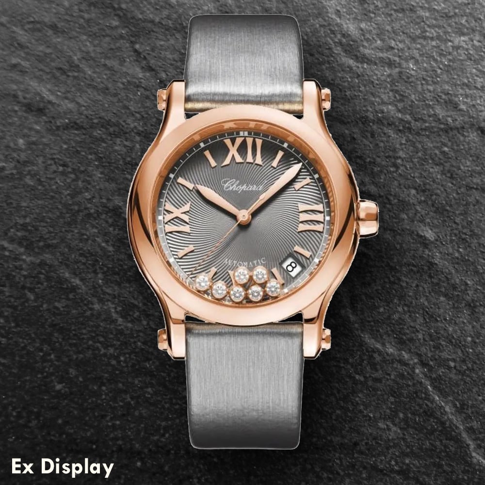 The Chopard Ladies Happy Sport Watch 274808-5012 combines a 36mm round shaped 18ct Rose Gold case and a glossy silver tone brushed fabric strap with a traditional buckle fastening. It has a grey guilloche analogue dial with dancing diamonds totalling 0.35 carats, and a date window between four and five o-clock, which is protected beneath glare-proofed scratch resistant sapphire crystal glass. The crown is also set with a single sapphire stone. Power is generated by the automatic movement with 25 jewels and a power reserve ofimately 42 hours. This model also has a sapphire crystal case back and a water resistance of up to 30 metres.