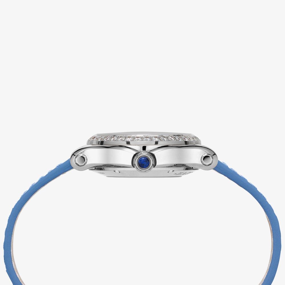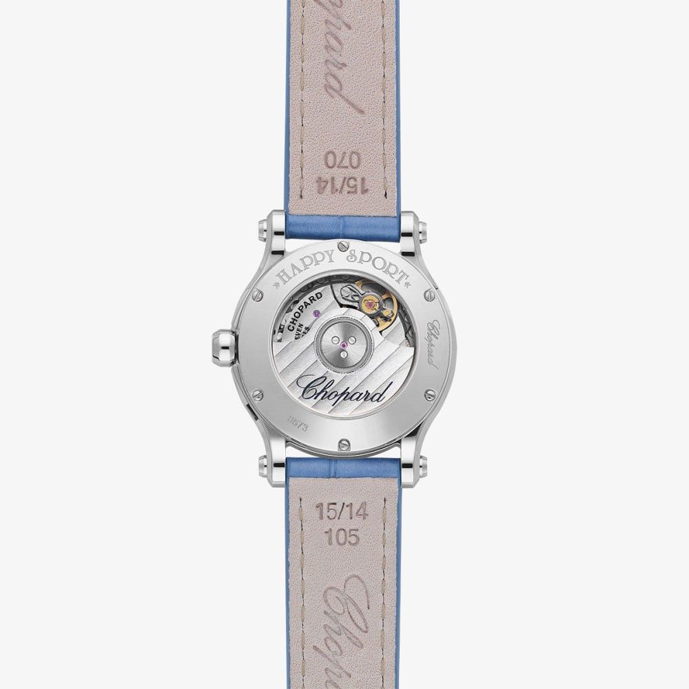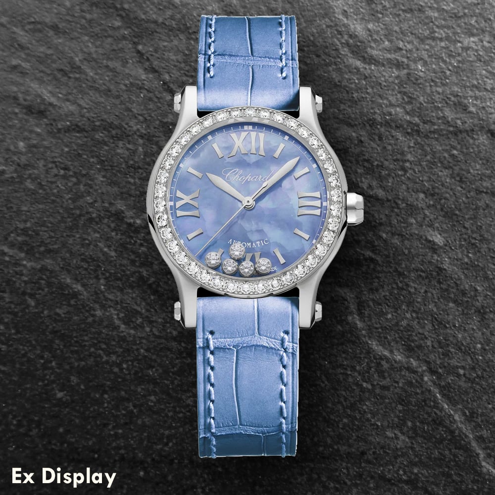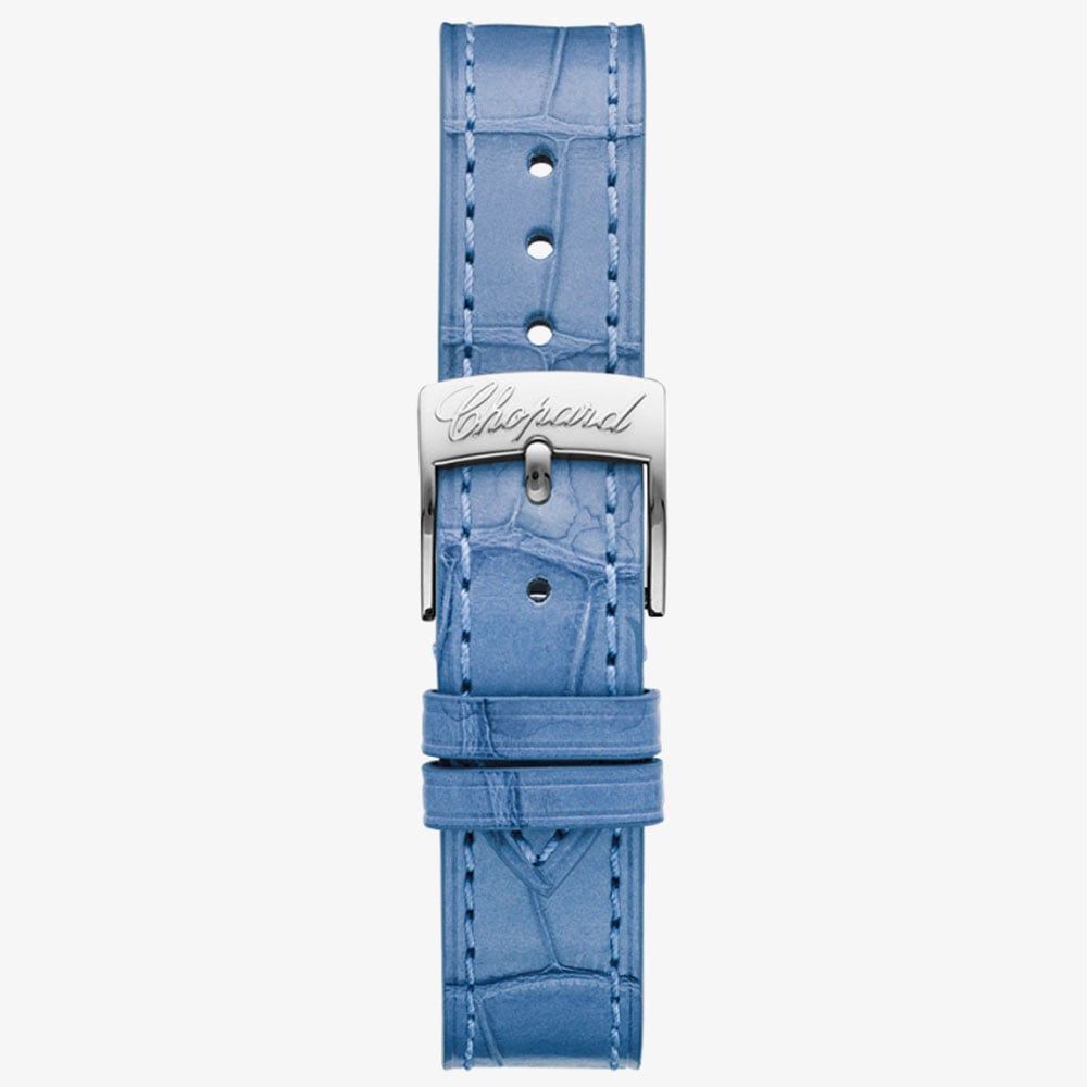The Chopard Ladies Happy Sport Watch 278573-3010 combines a 30mm round shaped stainless steel case and a blue alligator leather strap with a traditional buckle fastening. The diamond stone set bezel frames a blue textured mother of pearl analogue dial with dancing diamonds totalling 1.26 carats, which is protected beneath glare-proofed scratch resistant sapphire crystal glass. The crown is also set with a single sapphire stone. Power is generated by the automatic movement with 27 jewels and a power reserve ofimately 42 hours. This model also has a sapphire crystal case back and a water resistance of up to 30 metres.