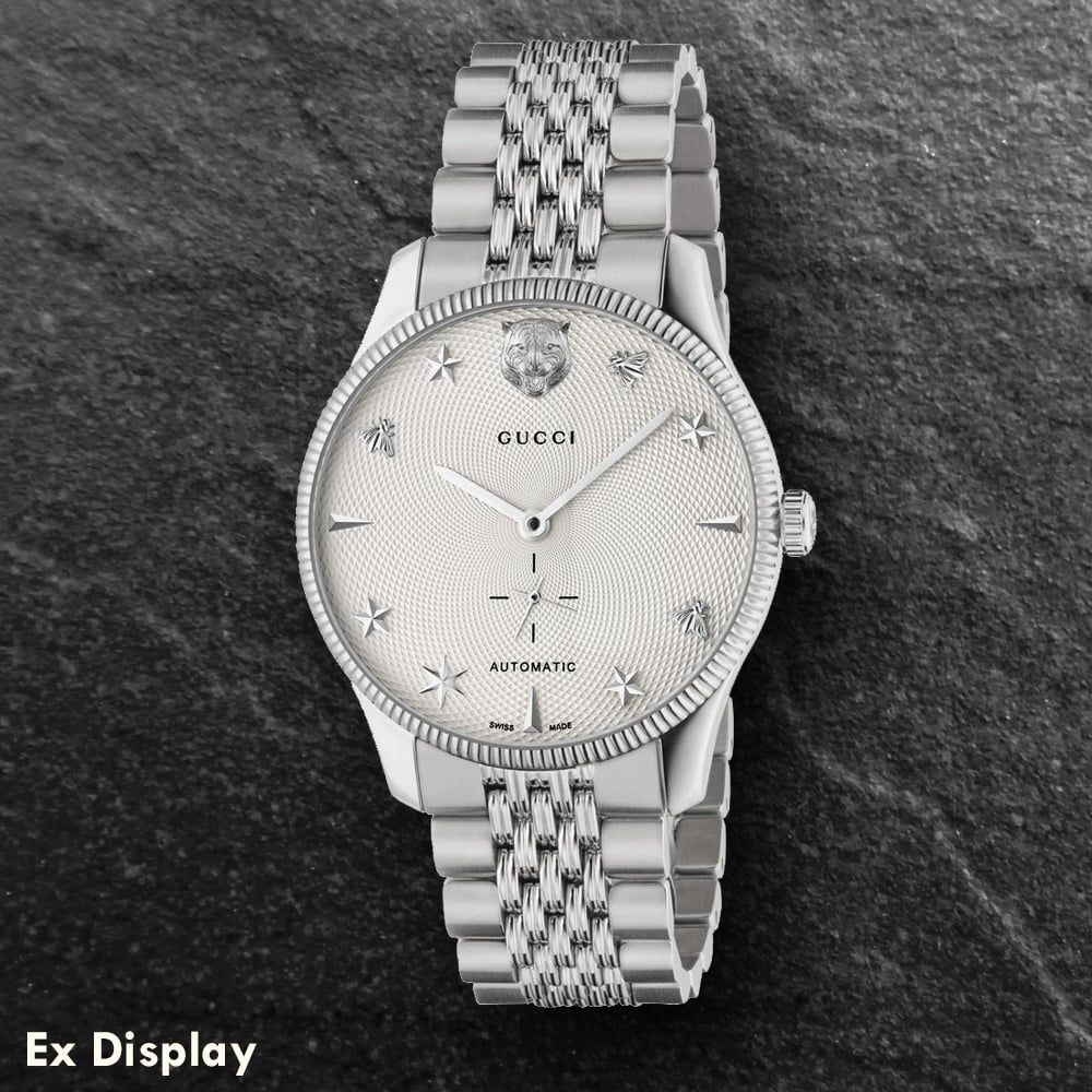 Part of the G-Timeless collection, this stunning automatic watch features a white guilloche dial enriched with silver toned house motif indexes - including the bee, the star and the feline head. The stainless steel case continues into a bracelet that is finished with a push deployment clasp fastening.