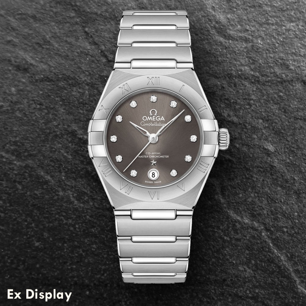The OMEGA 131.10.29.20.56.001 Constellation watch combines a 29mm round shaped stainless steel case and bracelet with a push button clasp. It has a grey analogue dial with 18k white gold Super-LumiNova filled hands and diamond hour markers which is protected beneath domed scratch resistant sapphire crystal glass with an anti-reflective treatment on both sides. Power is generated by the Co-Axial Master Chronometer Calibre 8700 automatic movement with 28 jewels and a power reserve of up to 50 hours. This model also has a diamond set bezel, a transparent case back, and a water resistance of up to 50 metres.
