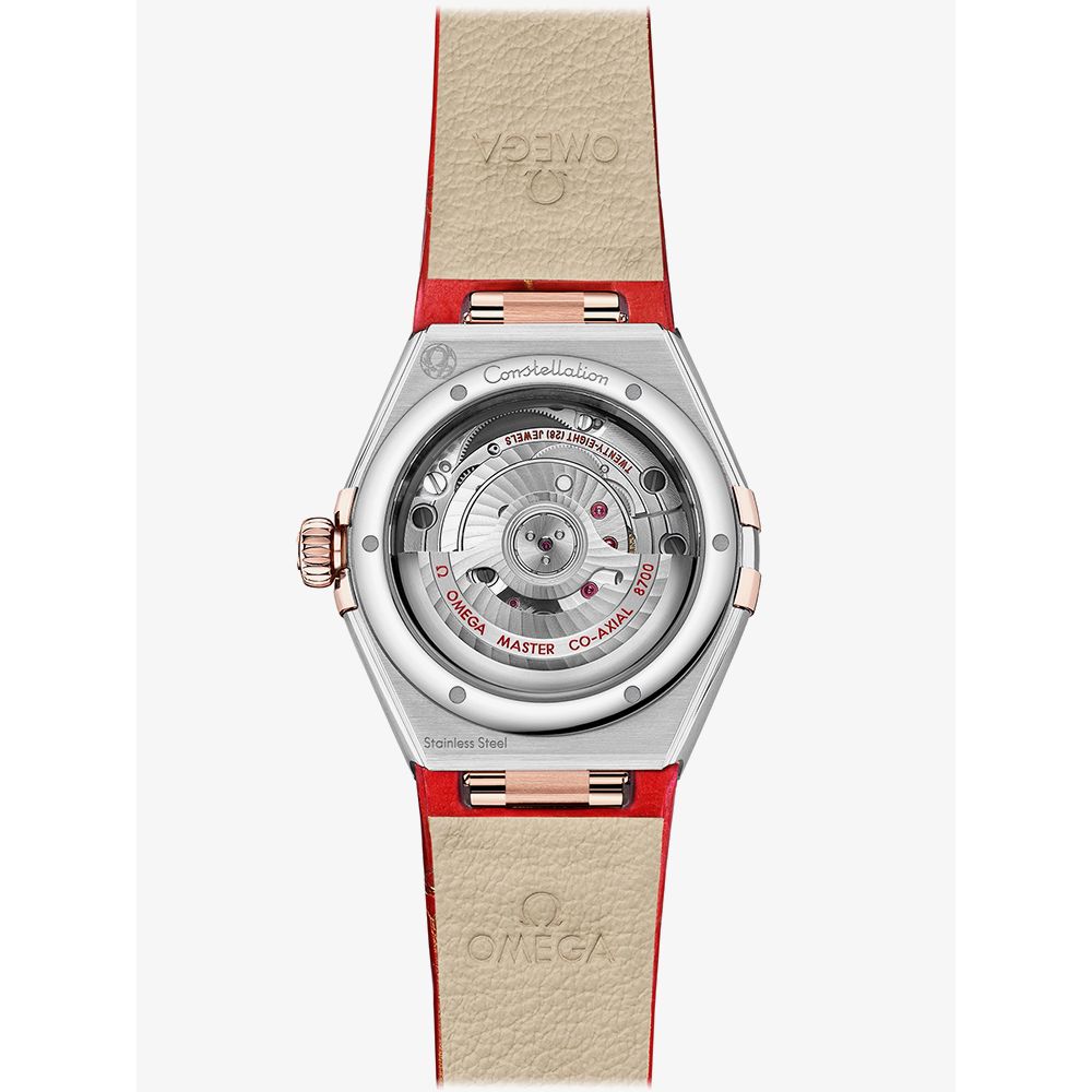 OMEGA Ladies Constellation Co-Axial Master Diamond Set Chronometer 131.23.29.20.99.003 watch combines a 29mm round-shaped stainless steel case with an 18ct Sedna rose gold bezel and an Aventurine natural red leather strap with a traditional buckle. It has a natural red Aventurine stone analogue dial with 18ct Sedna rose gold hands and diamond set indexes. The date is visible at position six, protected beneath domed scratch‑resistant sapphire crystal with anti‑reflective treatment on both sides. Power is generated by the OMEGA Co-Axial Master Chronometer Calibre 8700 automatic movement and has an approximate power reserve of 50 hours. This model also has a water resistance of up to 50 metres.
