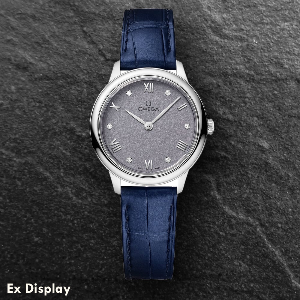The OMEGA 434.13.28.60.53.001 watch combines a 27mm round shaped stainless-steel case and a blue leather strap with a traditional buckle. It has a PVD purple grey analogue dial that features a crystal finish and is protected beneath domed scratch resistant sapphire crystal glass with anti-reflective treatment on both sides. Power is generated by the OMEGA calibre 4061 “long life” quartz movement. This model also has a water resistance of up to 30 metres.